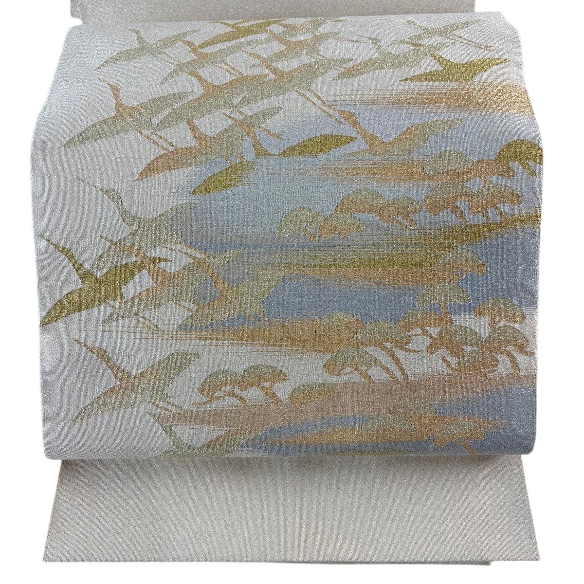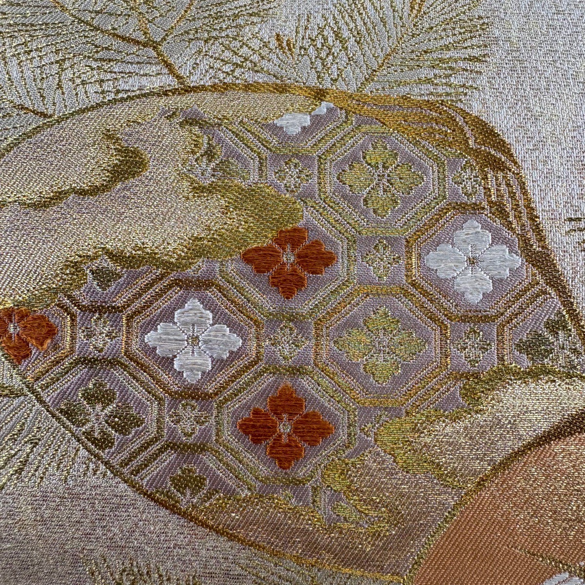 名古屋帯 名品 松葉仕立て 八寸名古屋帯 鶴 松 金銀糸 ベージュ 正絹