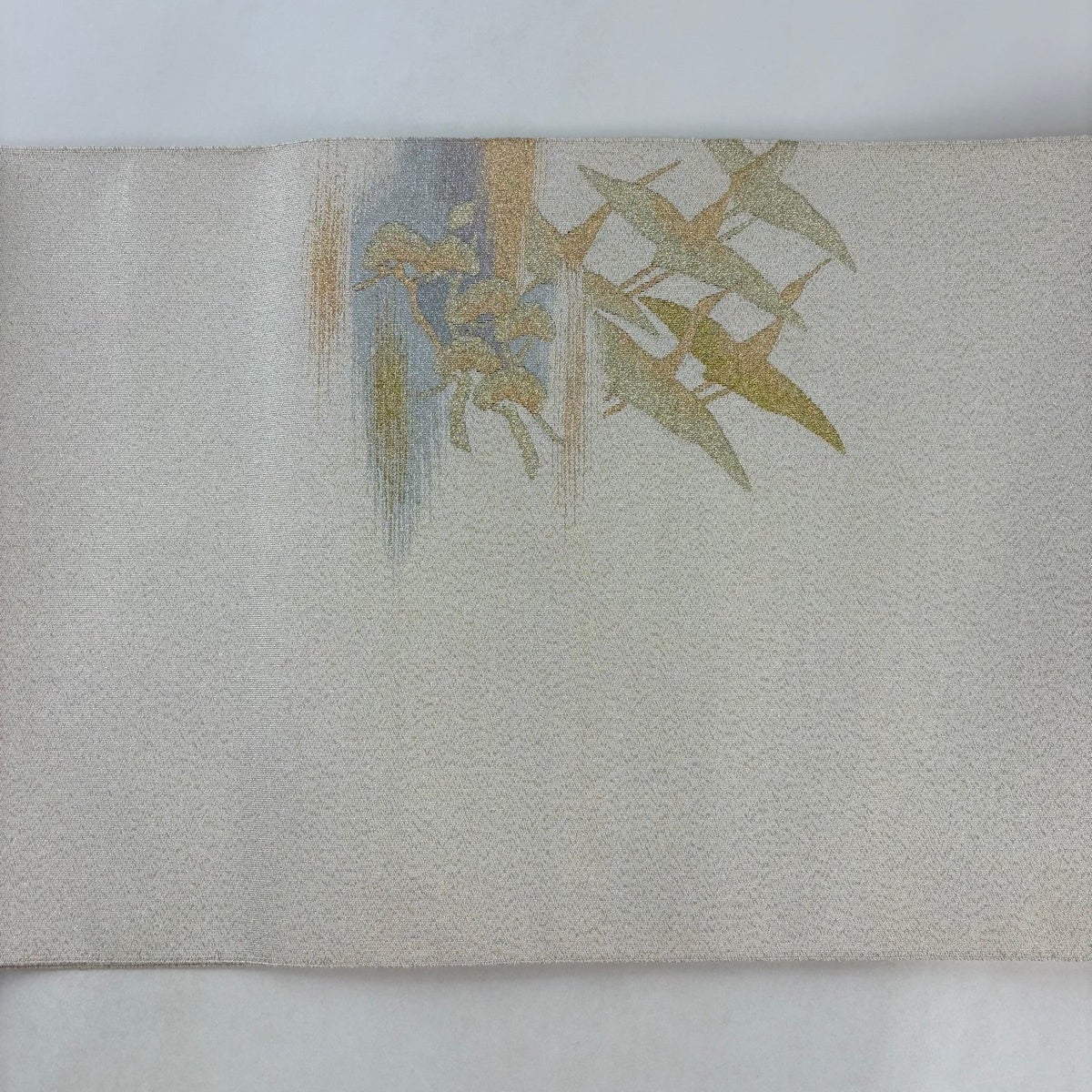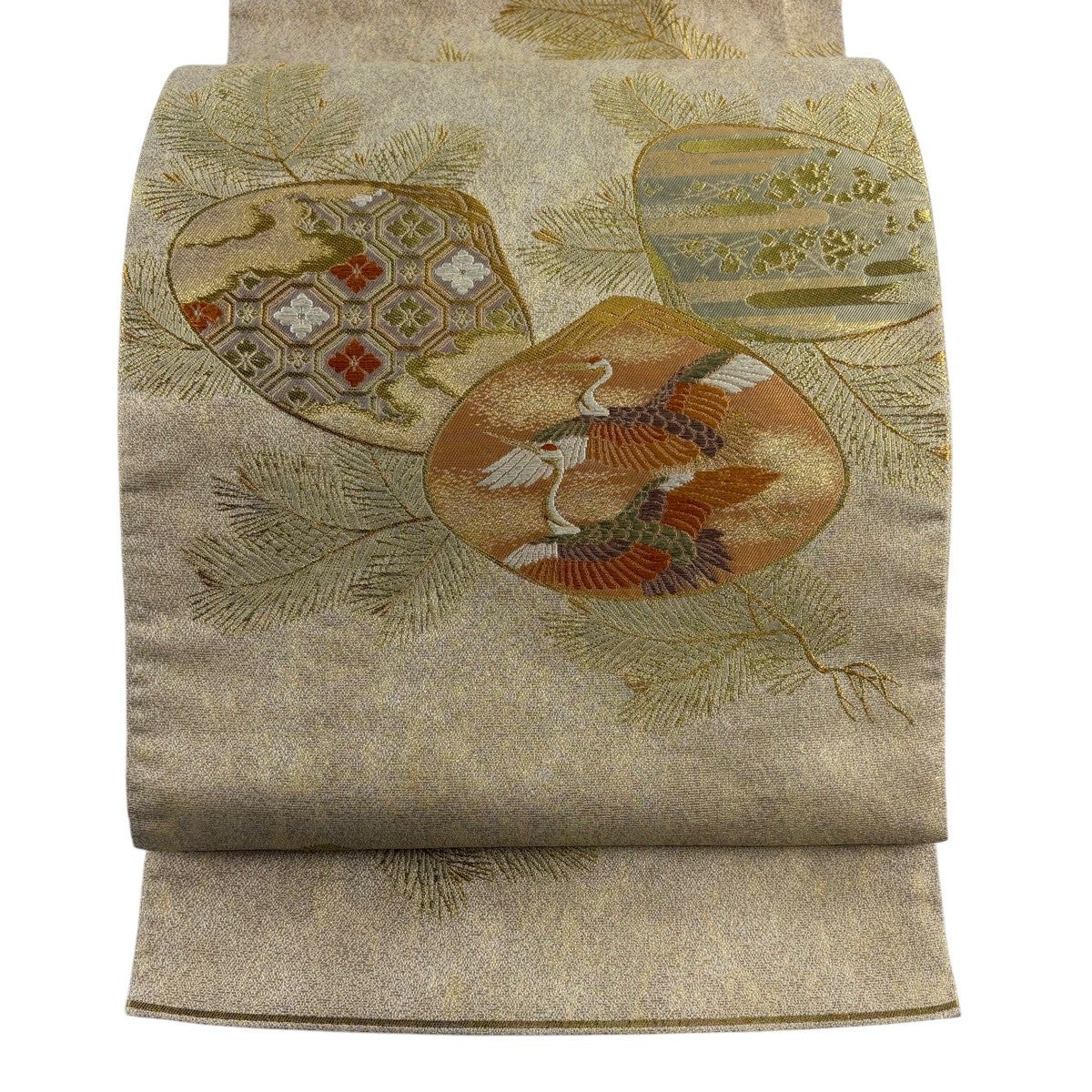 【美品】 袋帯 秀品 鶴 若松 金糸 箔 ベージュ 六通 正絹