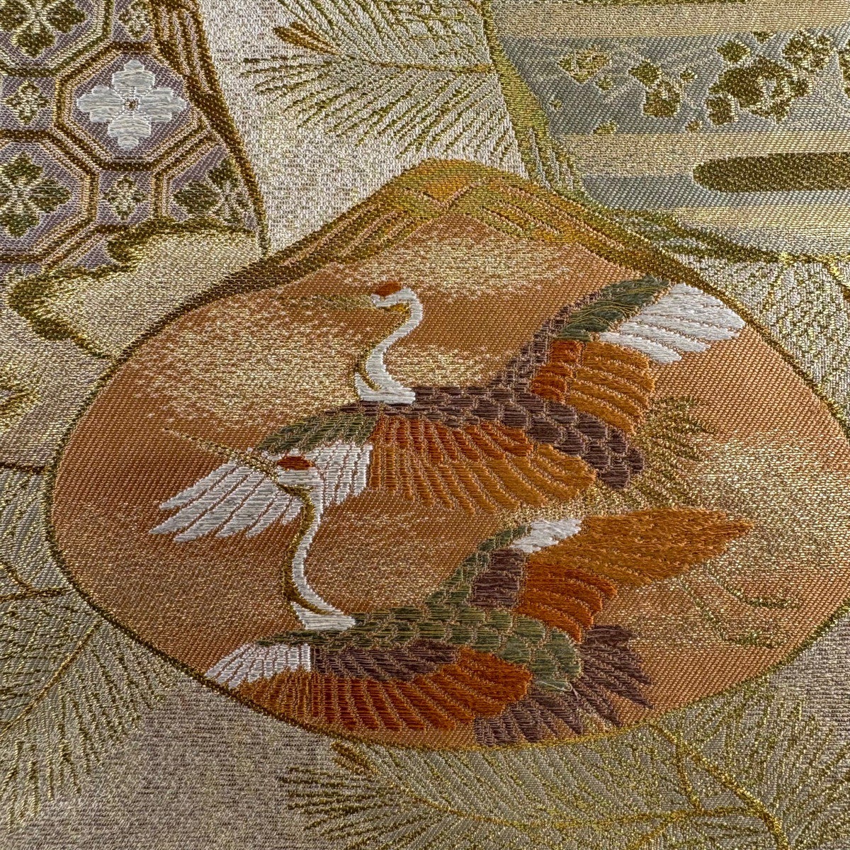 袋帯 秀品 関西仕立て 鶴 松 金糸 箔 ベージュ 六通 正絹