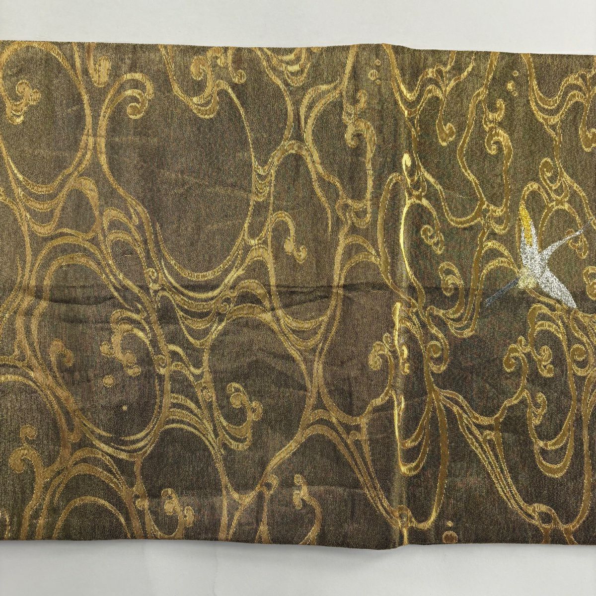 【美品】 袋帯 名品 関西仕立て 菱 鶴 箔 金糸 茶色 六通 正絹