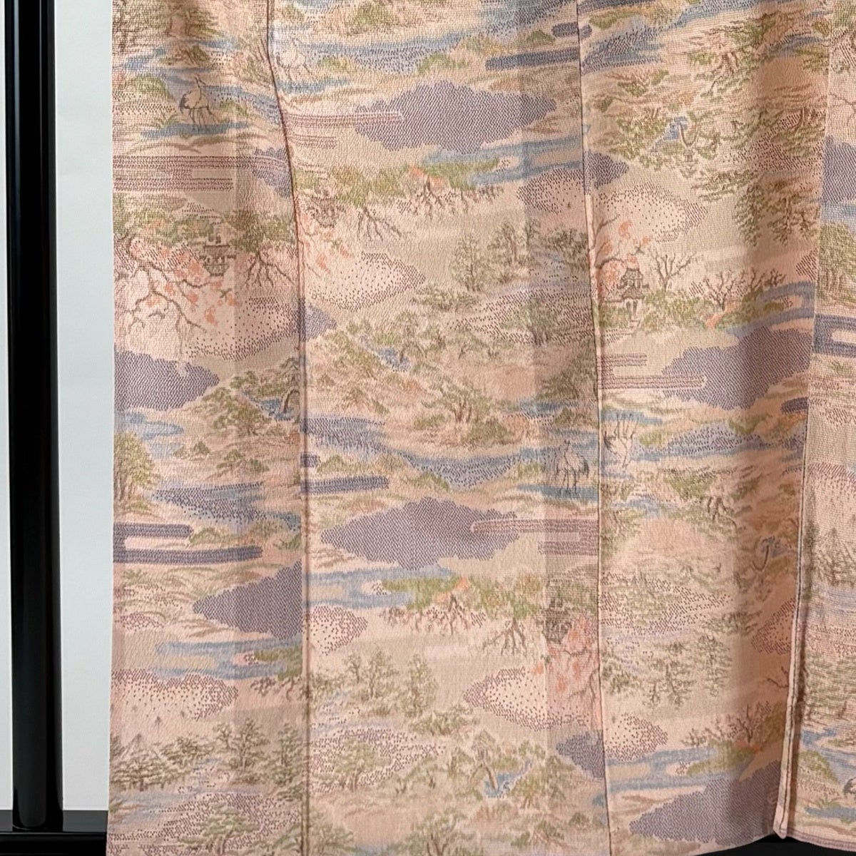 【美品】 紬 身丈160cm 裄丈64cm M 単衣 風景 鶴 ピンク 正絹 名品