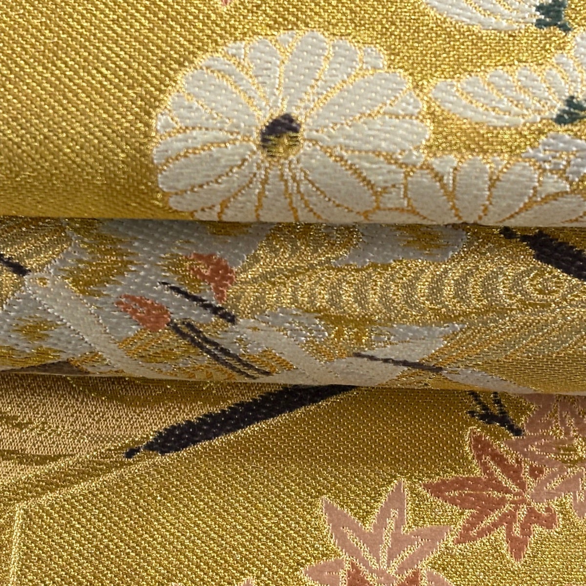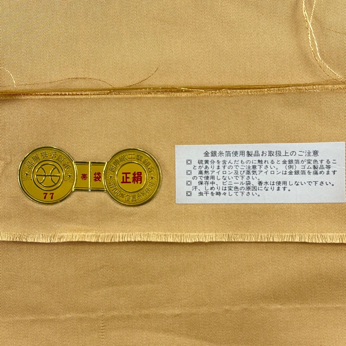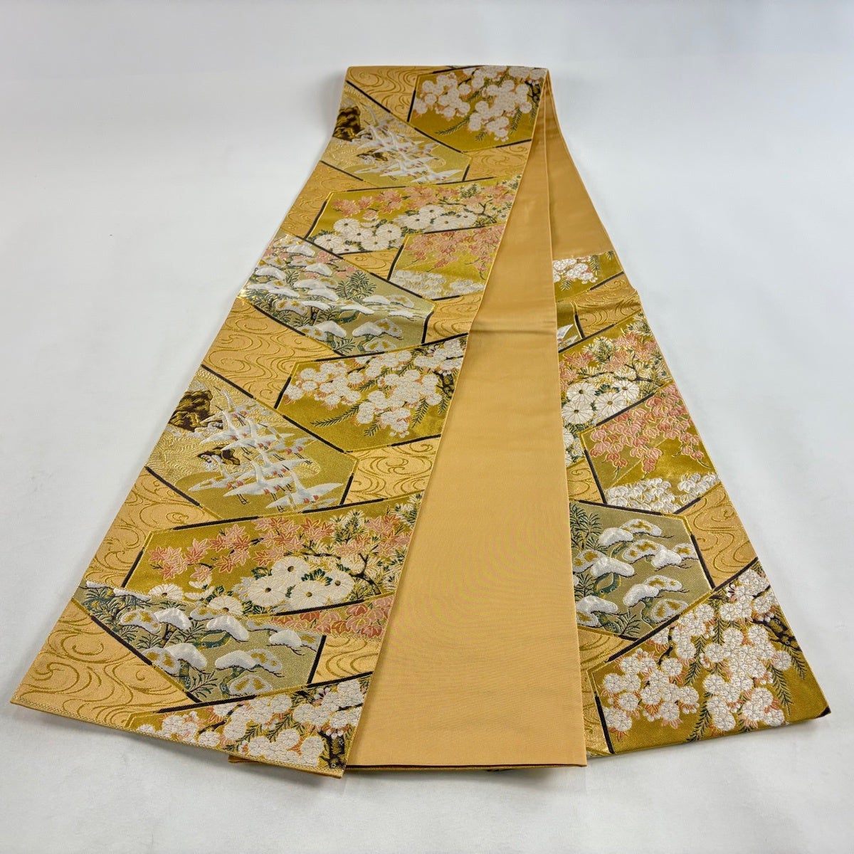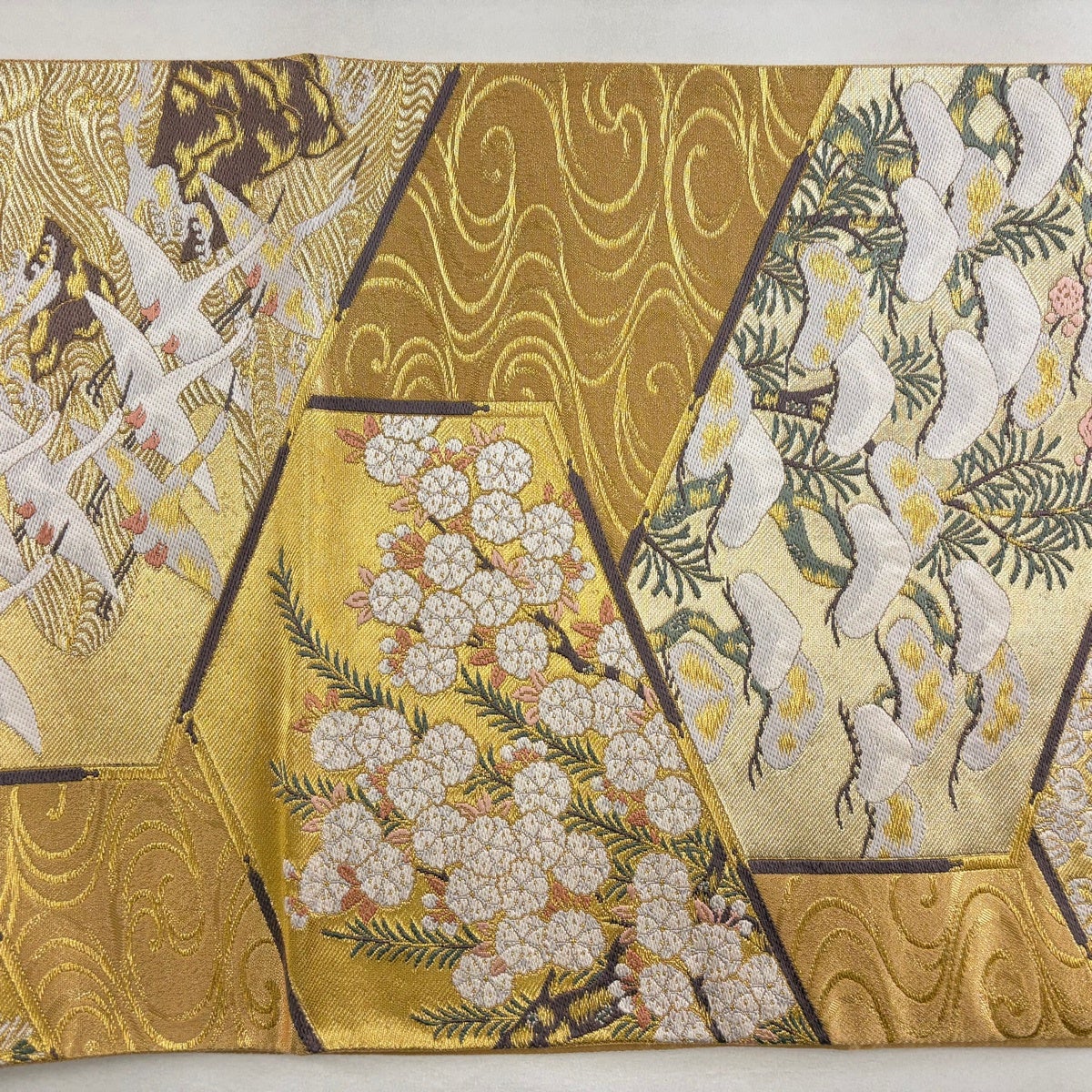 袋帯 秀品 となみ織物 落款あり 証紙あり 鶴 花 金銀糸 箔 クリーム 六通 正絹