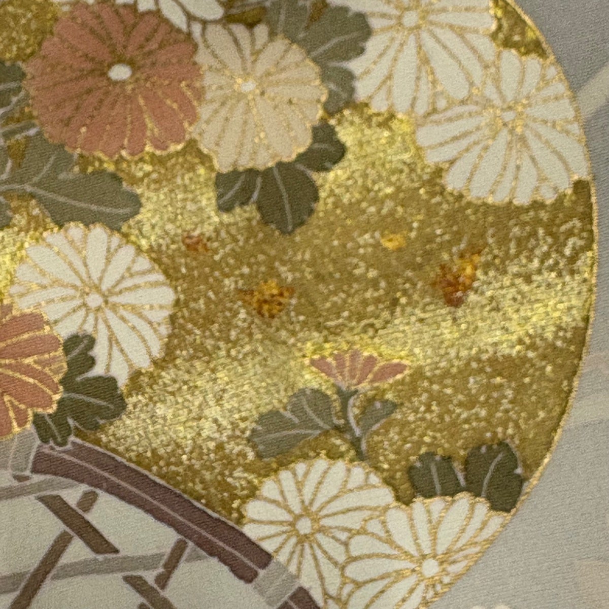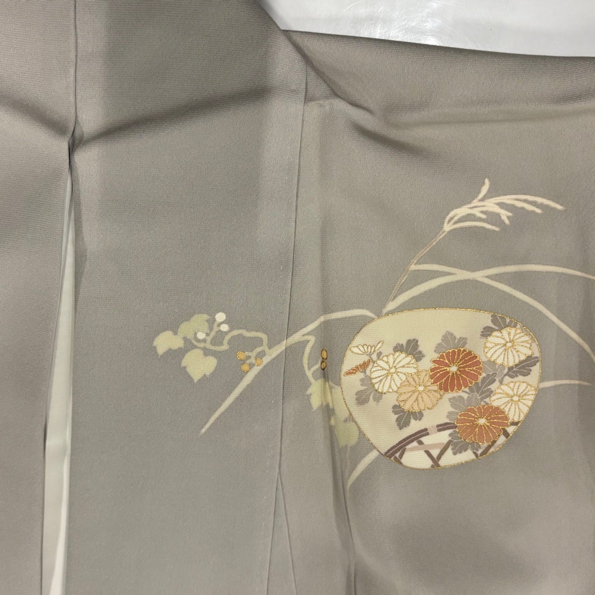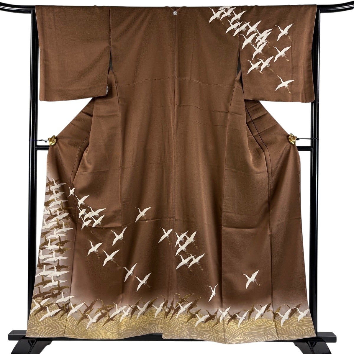 色留袖 身丈160.5cm 裄丈66cm M 袷 鶴 扇面 金糸 金彩 薄茶色 正絹 秀品 一つ紋