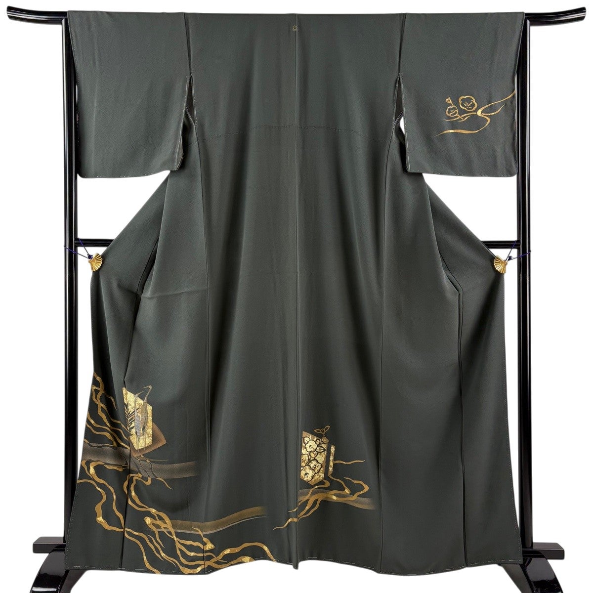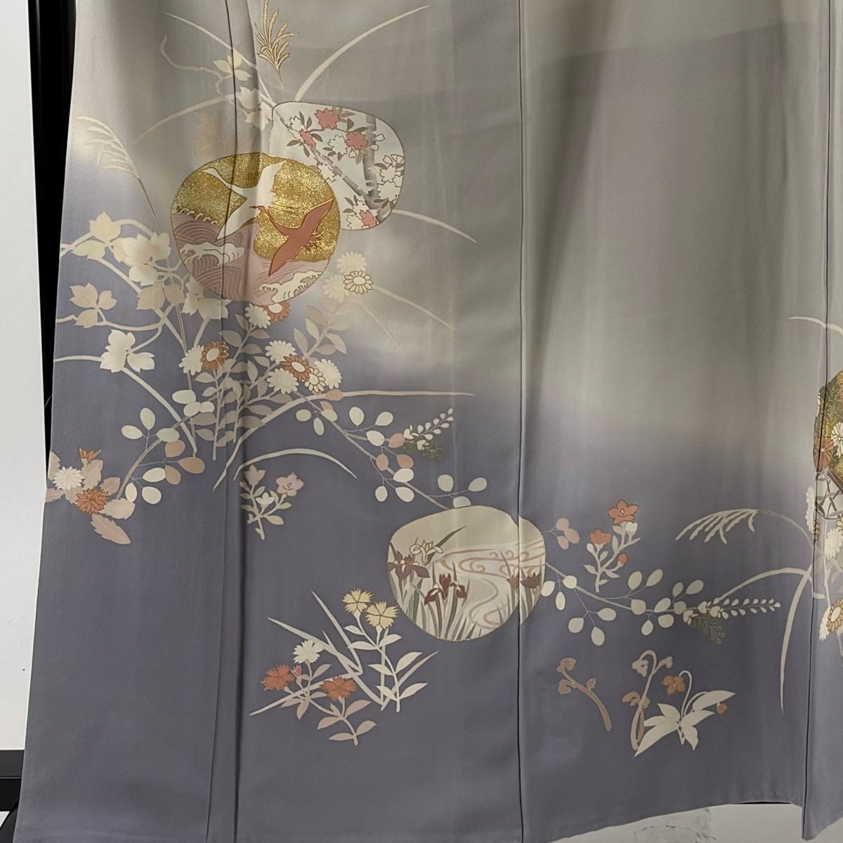 色留袖 身丈158.5cm 裄丈66.5cm M 袷 鶴 花丸文 金糸 金彩 青灰色 正絹 秀品 一つ紋