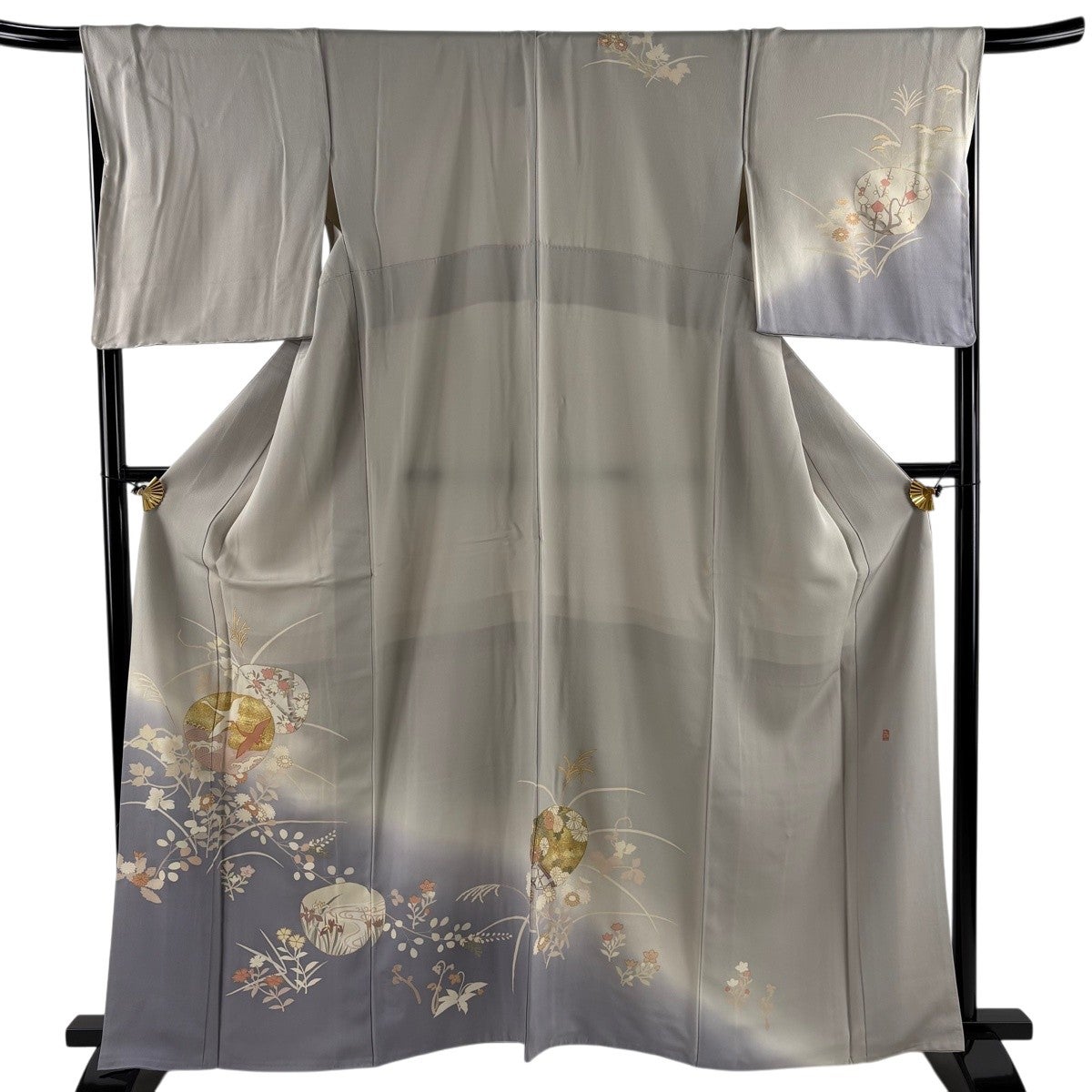 訪問着 身丈162cm 裄丈63cm S 袷 帝王紫 落款あり 鶴 波 金糸 金彩 灰色 正絹 逸品