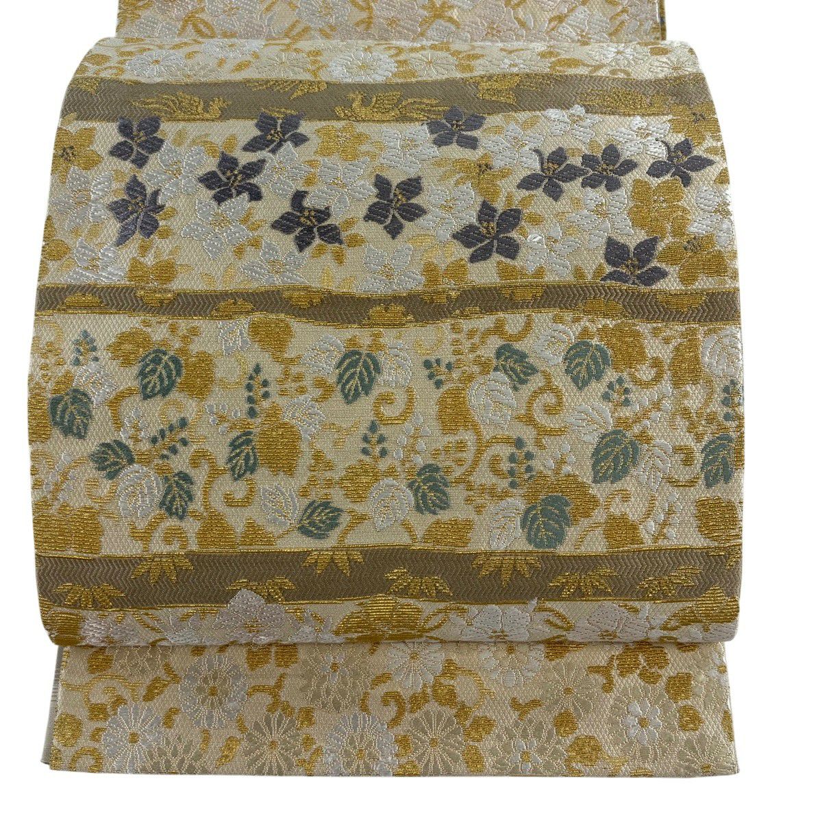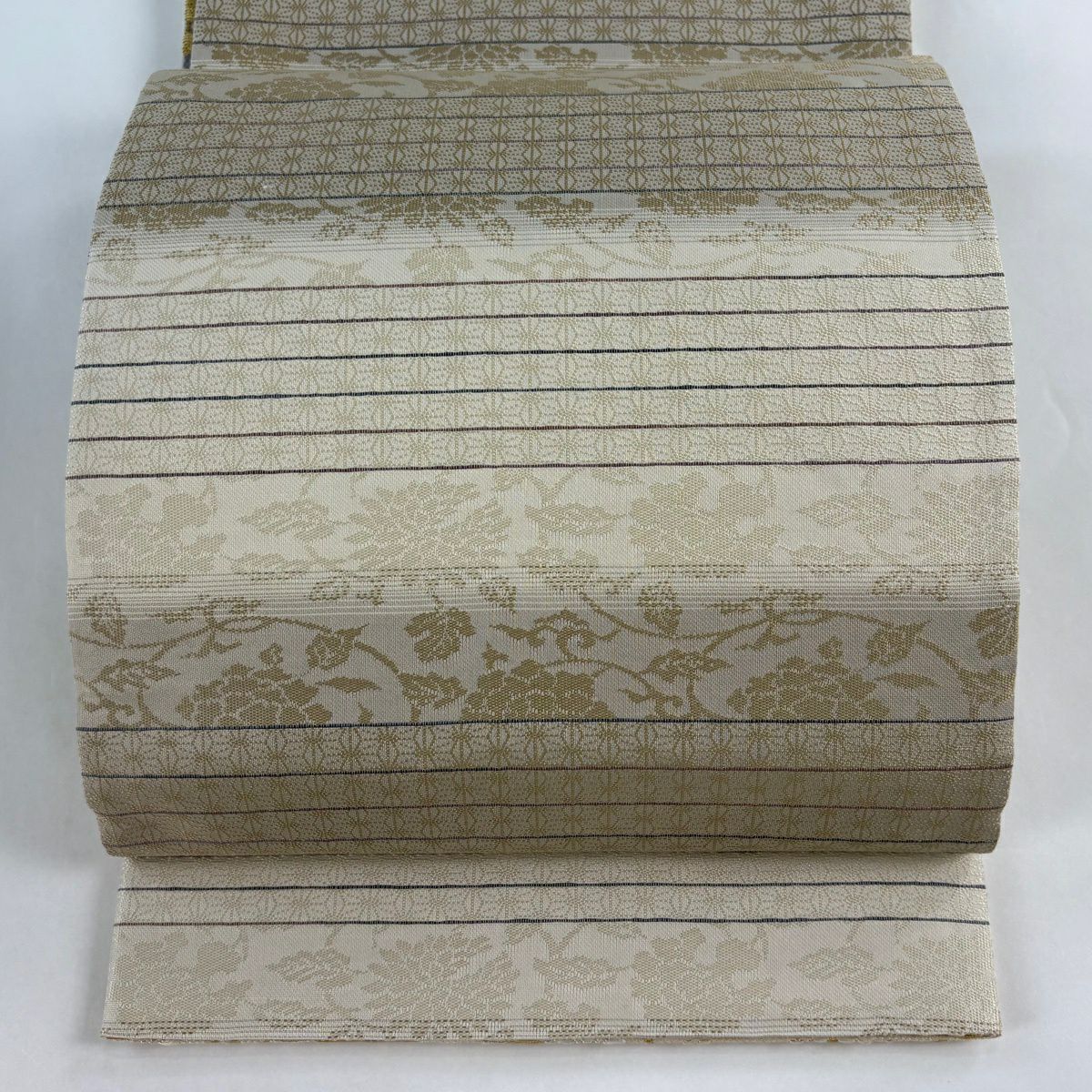 【美品】 袋帯 名品 リバーシブル 花唐草 麻の葉 金華山織 刺繍 ベージュ お太鼓柄 正絹