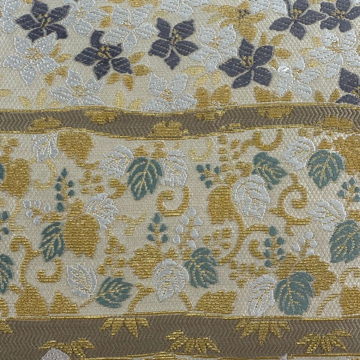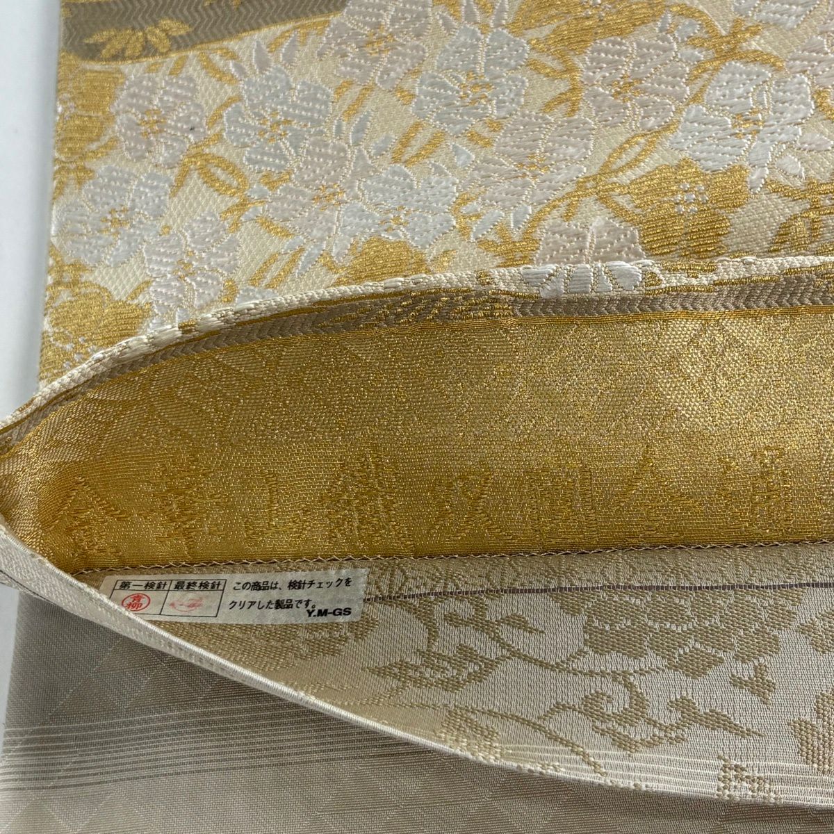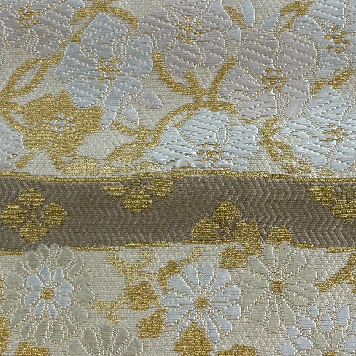 【美品】 袋帯 逸品 落款あり 岩下志麻 草花 変わり市松 金糸 刺繍 クリーム 六通 正絹