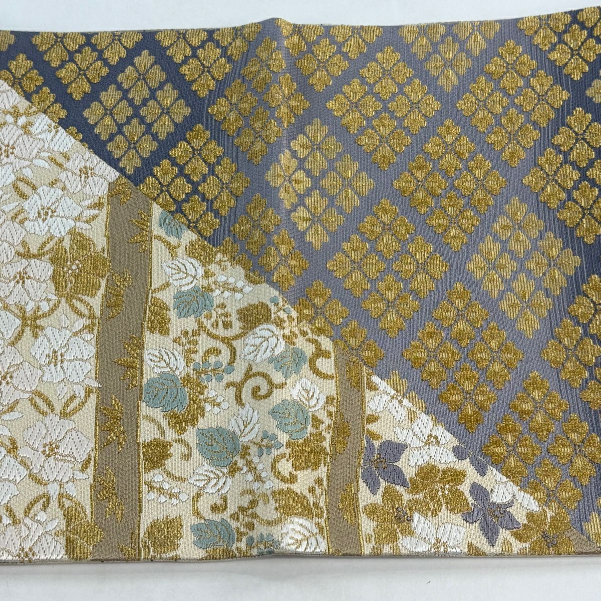 【美品】 袋帯 秀品 草木染つづれ 華文 麻の葉 金銀糸 箔 灰白 六通 正絹