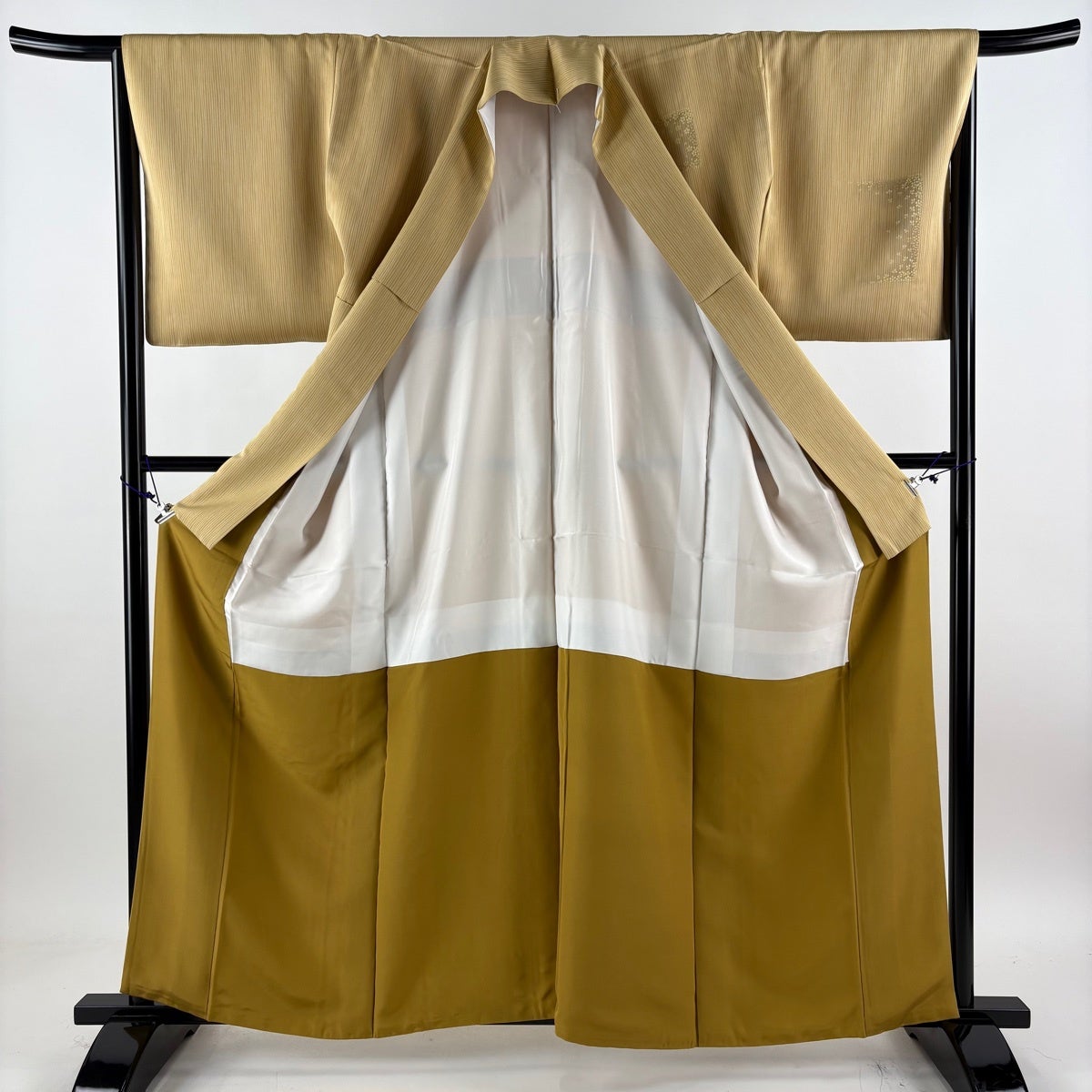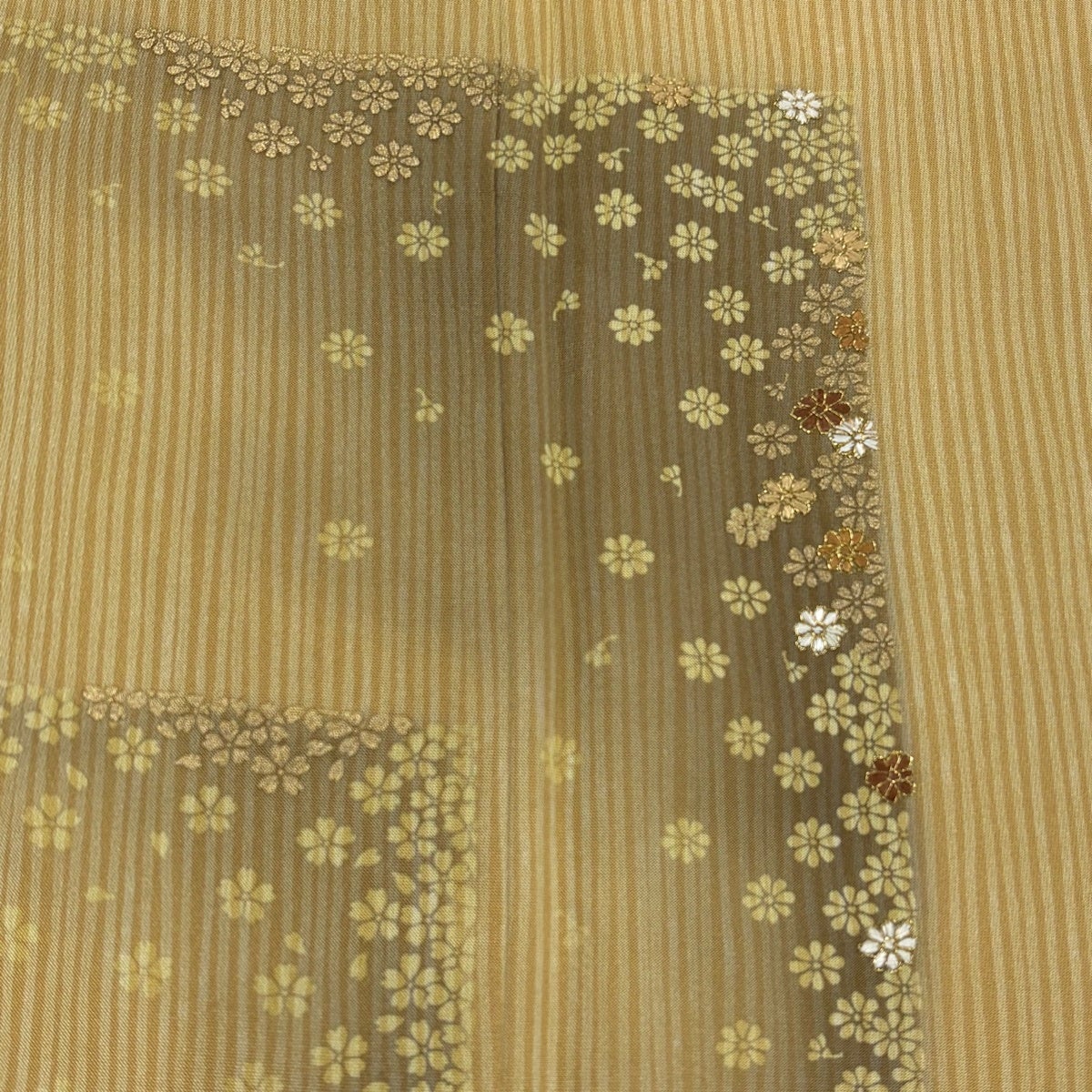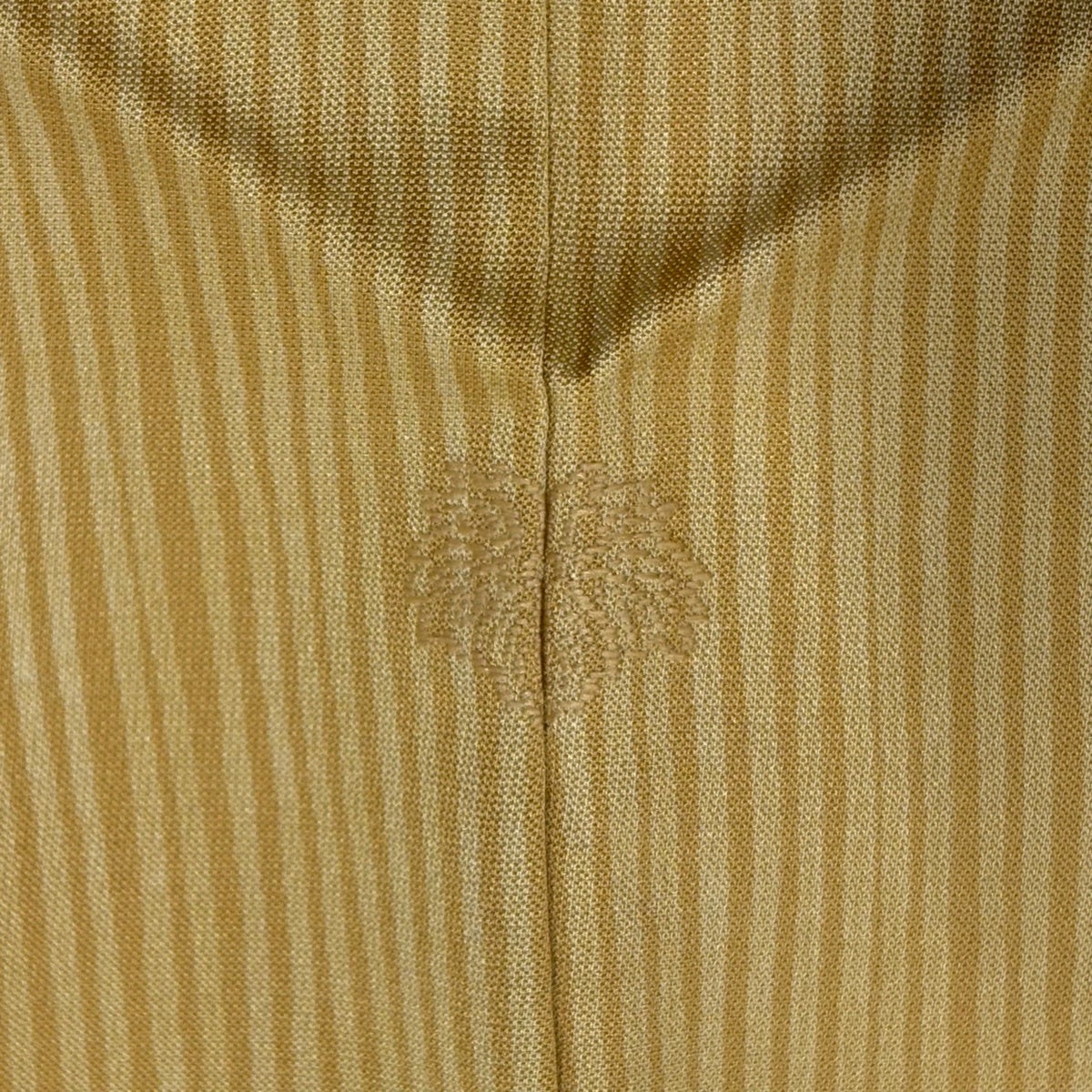 他の画像を見る 30%OFF 付下げ 身丈161.5cm 裄丈66.5cm M 袷 袋帯セット 菊 縦縞 金糸 刺繍 薄黄土色 正絹 秀品 一つ紋 K30 当店通常価格 ¥ 20,800 ¥ 14,560 税込