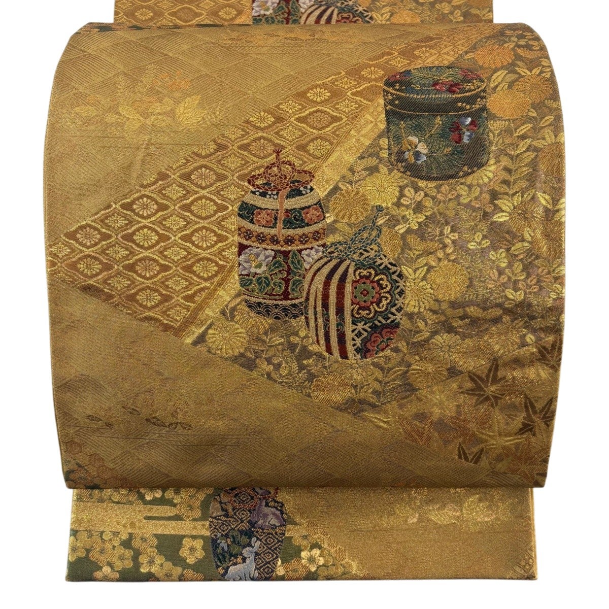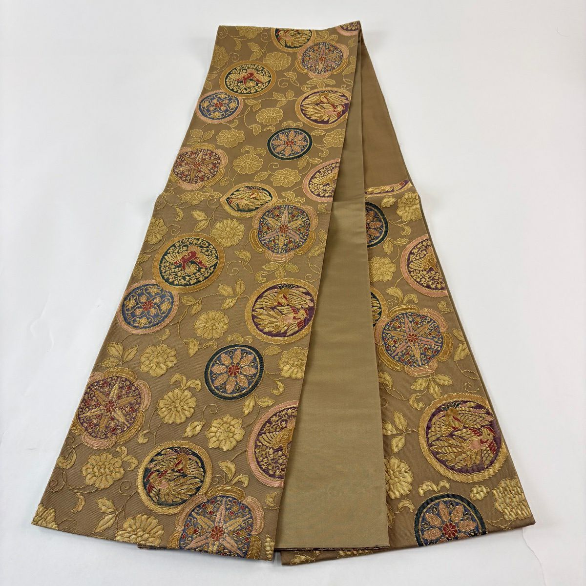 袋帯 名品 引箔本袋帯 関西仕立て 華文 松皮菱 金糸 箔 黄土色 六通 正絹