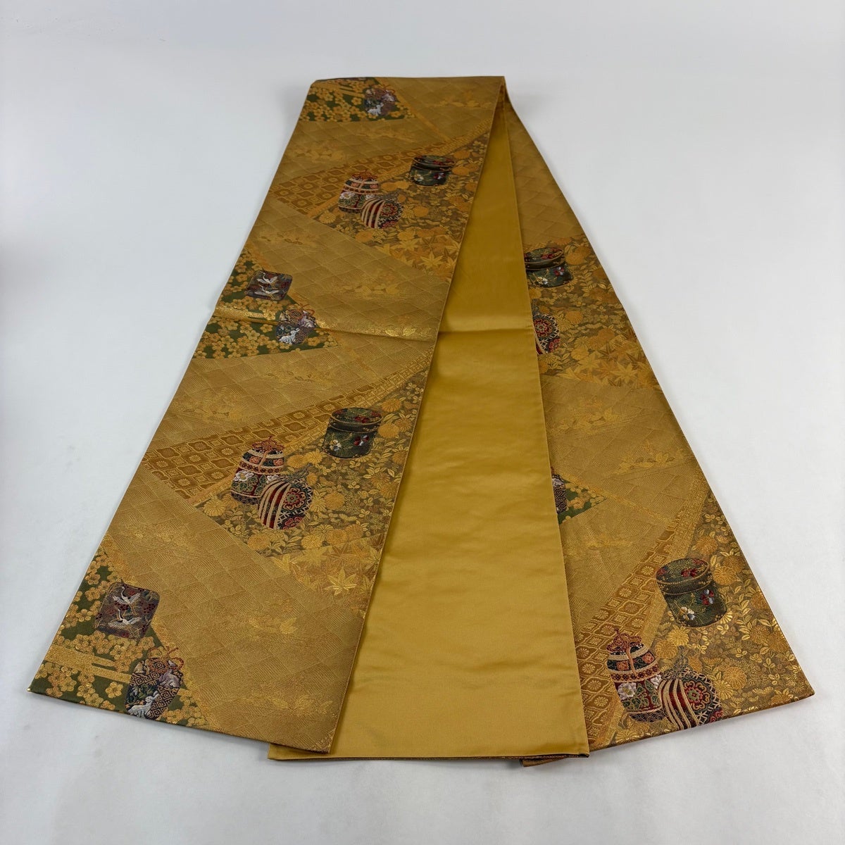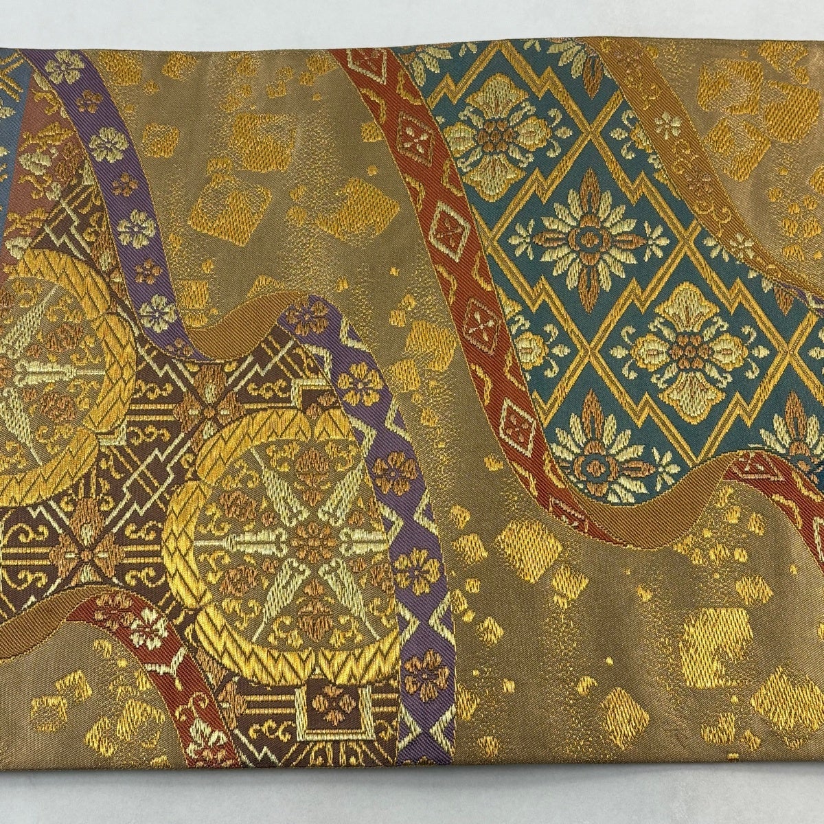 50%OFF 【美品】 袋帯 秀品 幾何学 金糸 黄土色 全通 正絹 K50