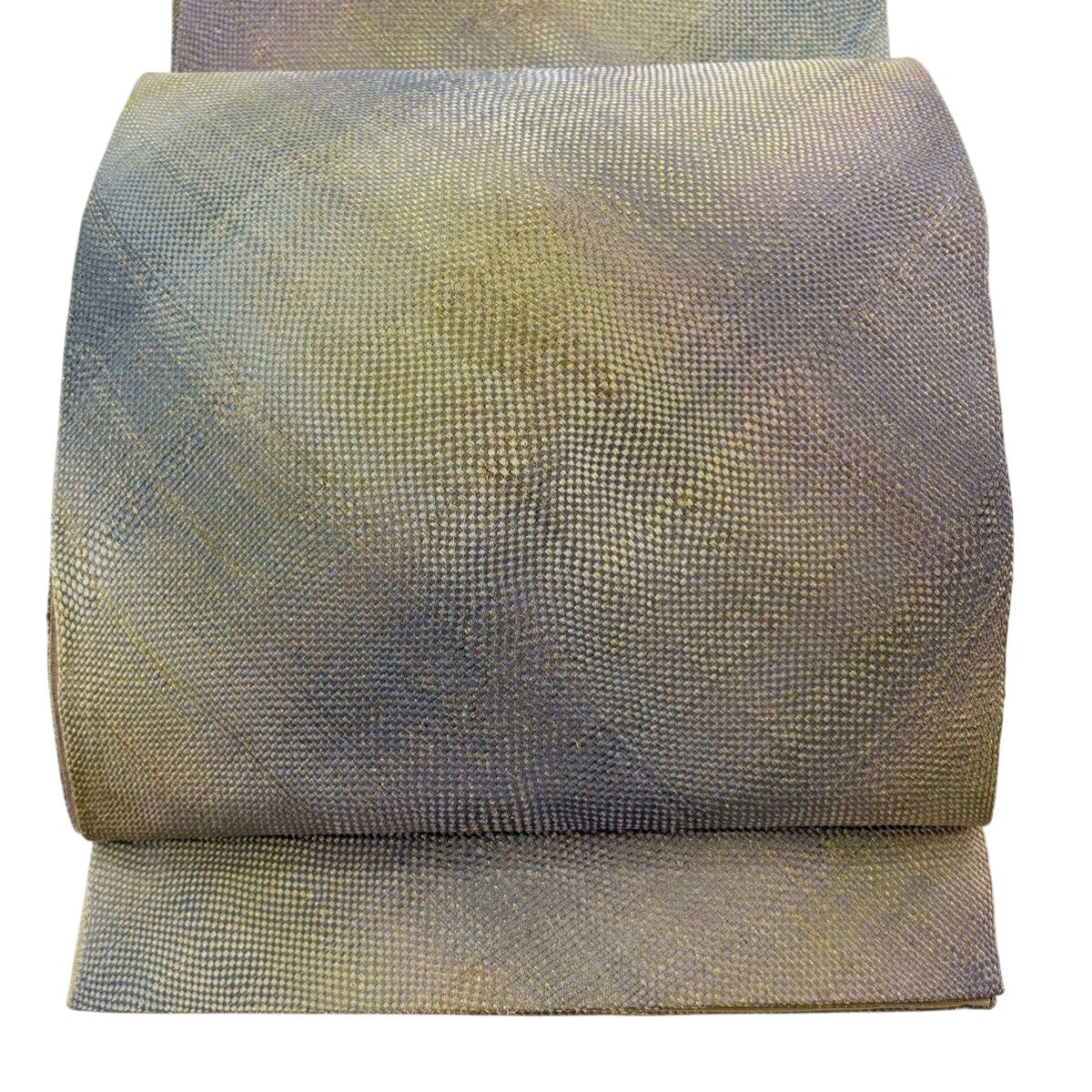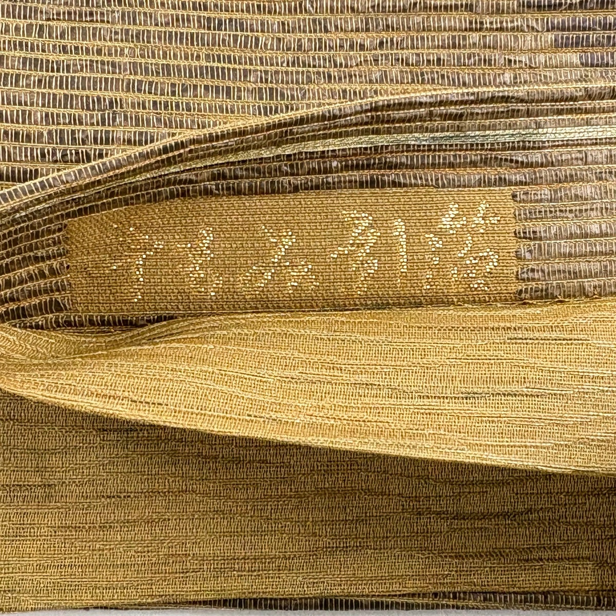 【美品】 名古屋帯 逸品 栗山吉三郎 落款あり 筋斗雲 立涌 縮緬 黄土色 正絹