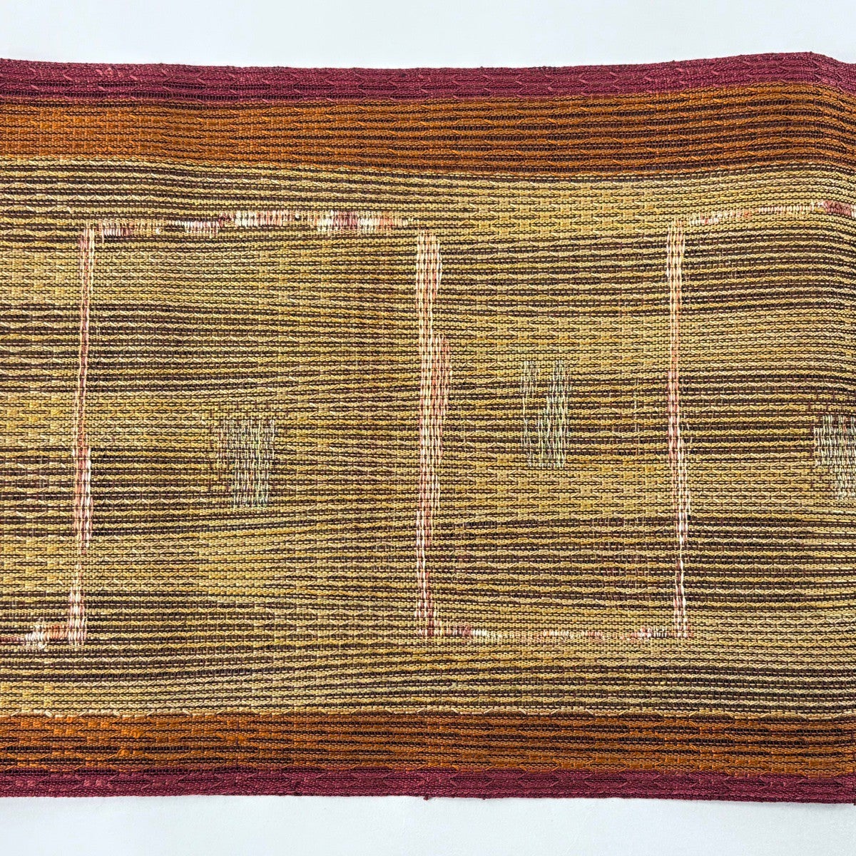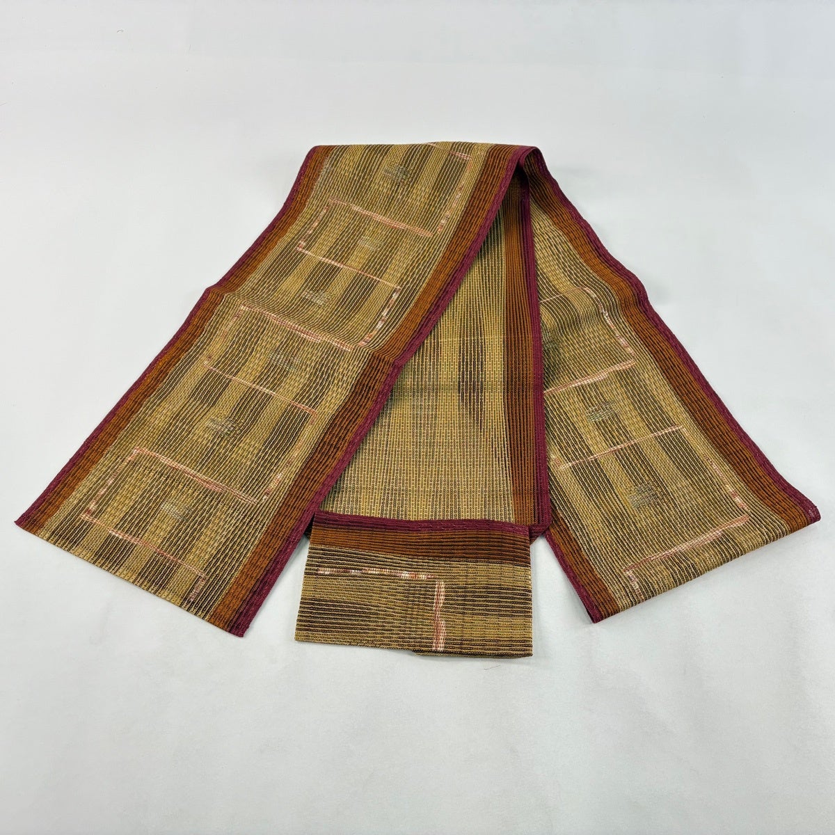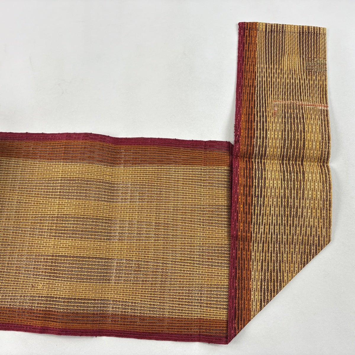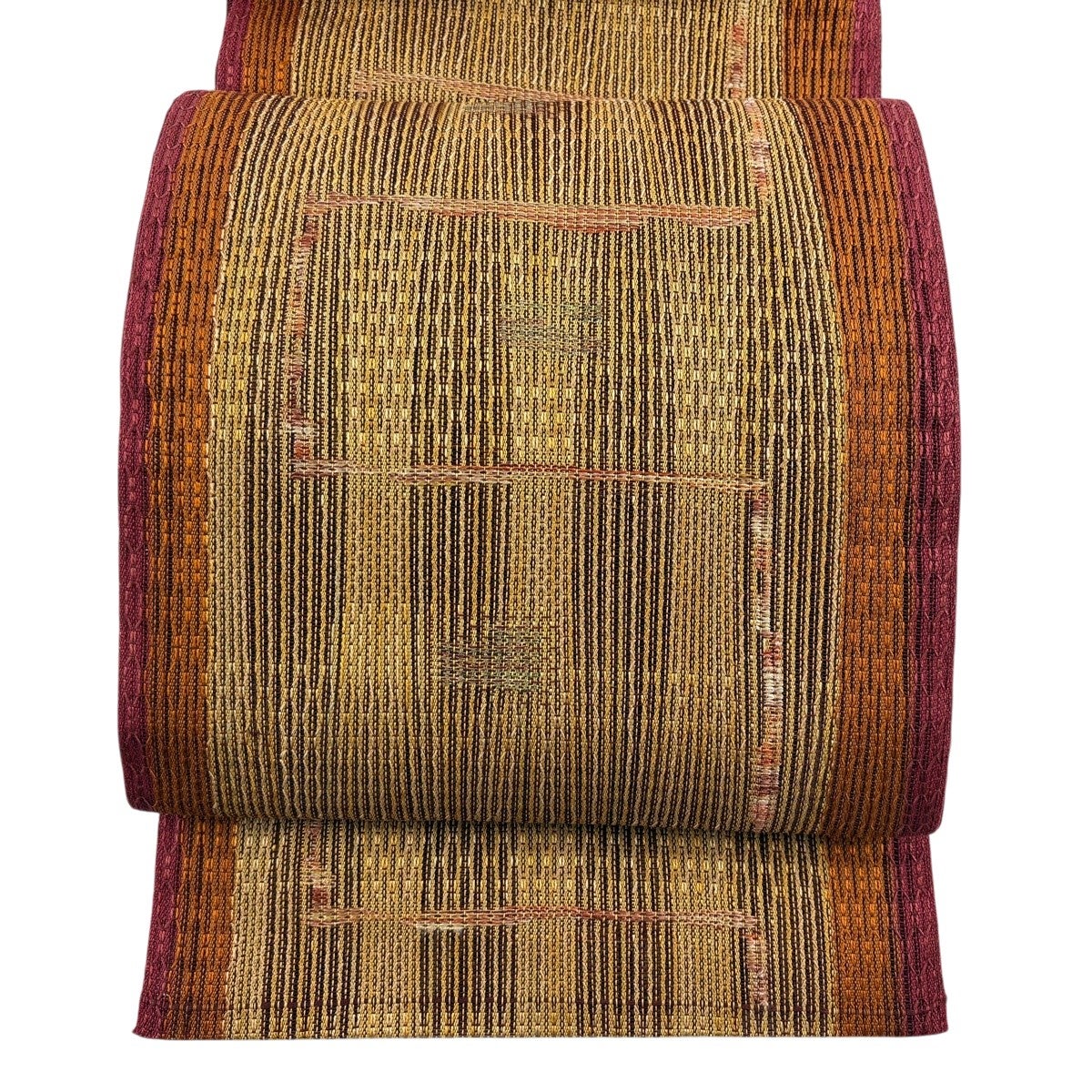50%OFF 袋帯 秀品 夏帯 幾何学模様 縞 黄土色 お太鼓柄 正絹 K50