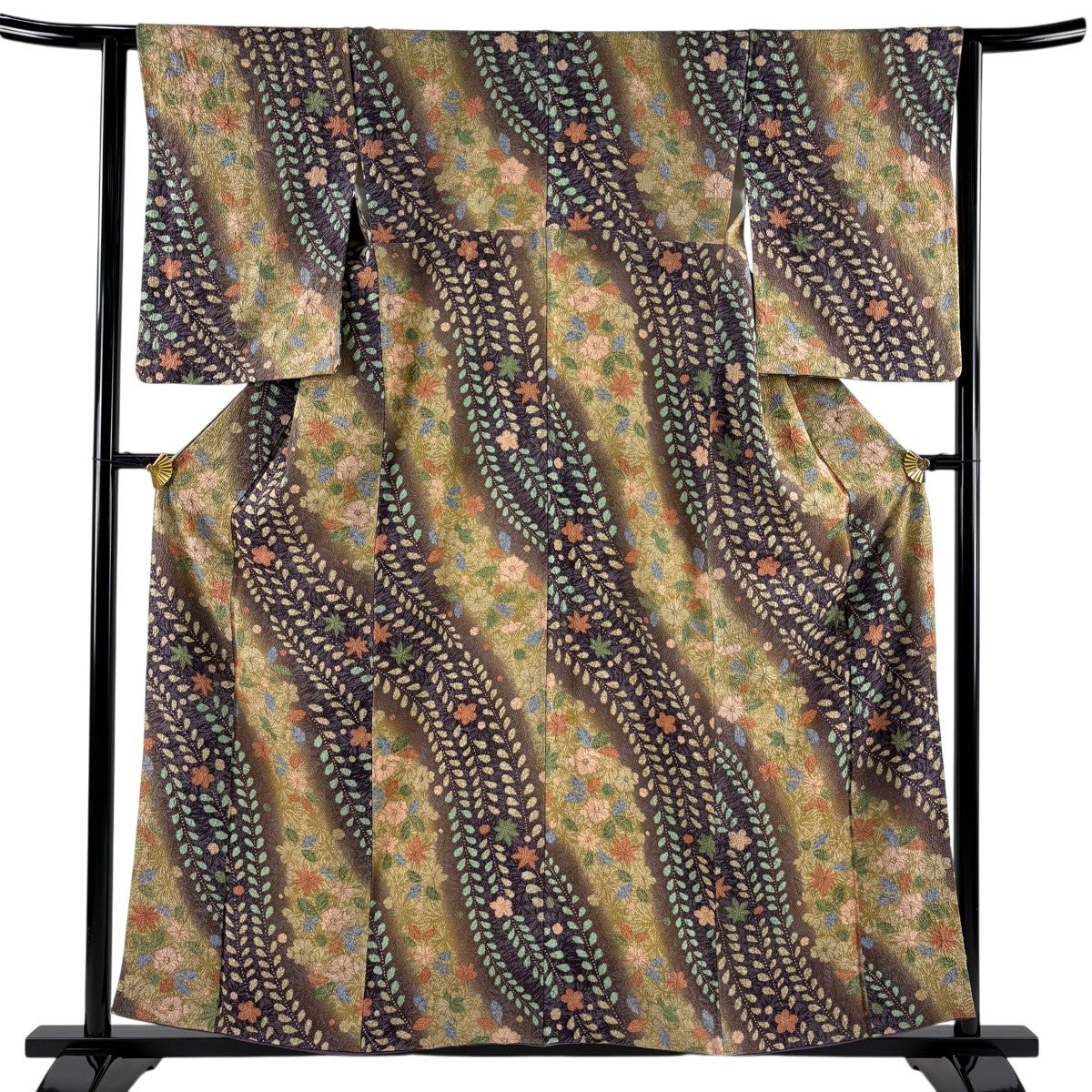 小紋 身丈159cm 裄丈63cm S 袷 草花 金彩 絞り 黄土色 正絹 秀品