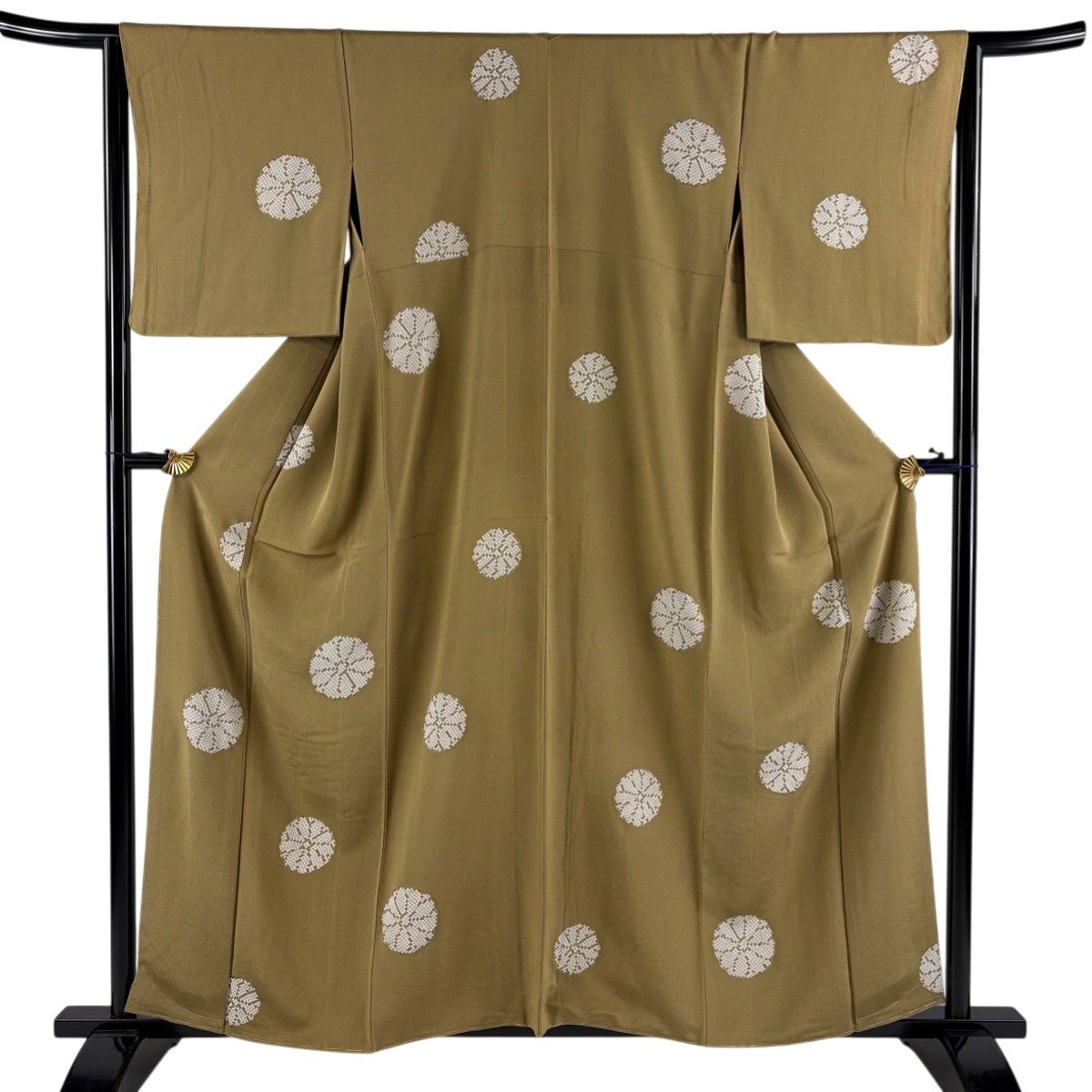 【美品】 訪問着 身丈170cm 裄丈66cm M 袷 扇 菊 金彩 黄土色 正絹 秀品
