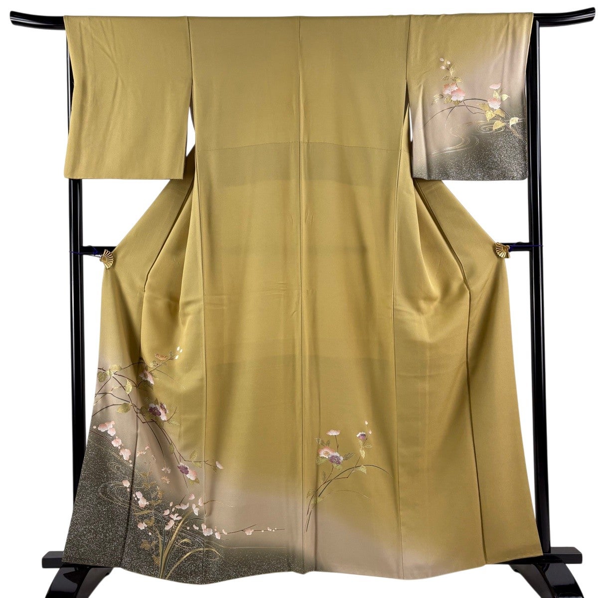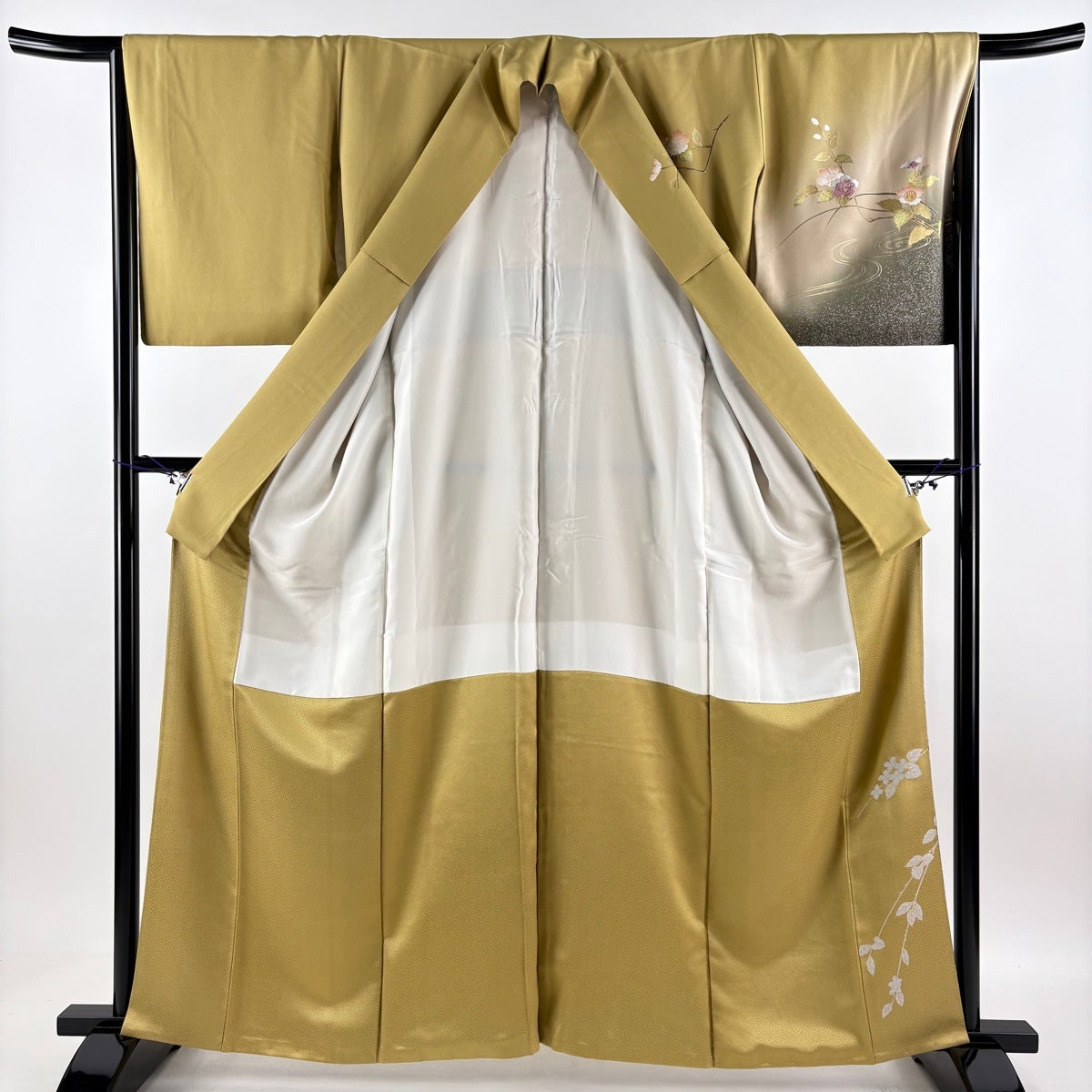 付下げ 身丈161cm 裄丈65cm M 袷 草花 流水 螺鈿 金銀彩 黄土色 正絹 名品
