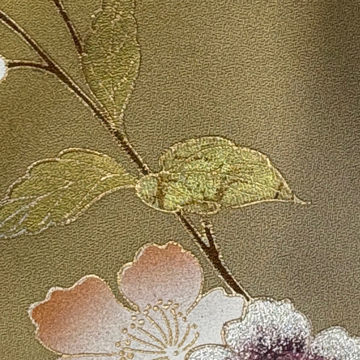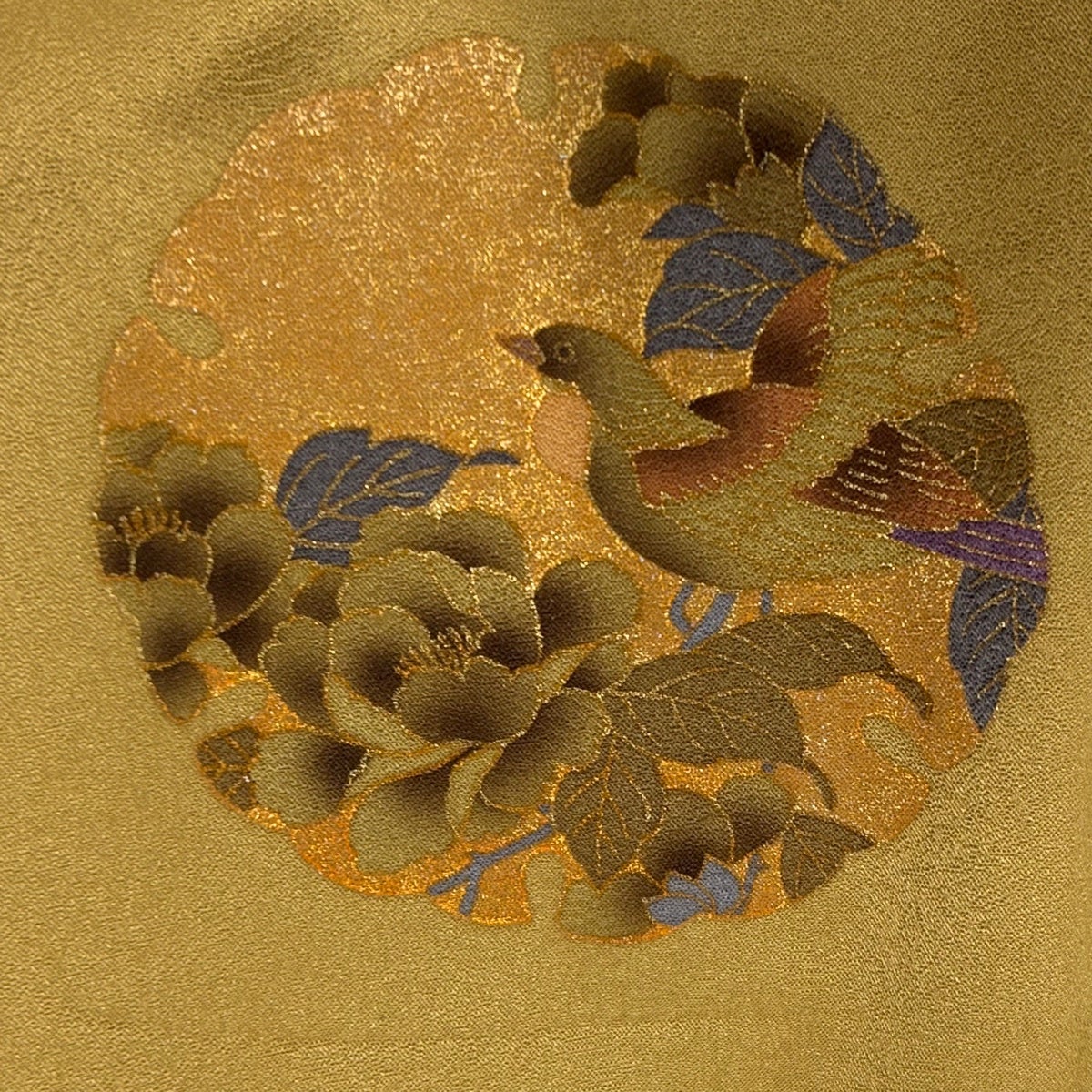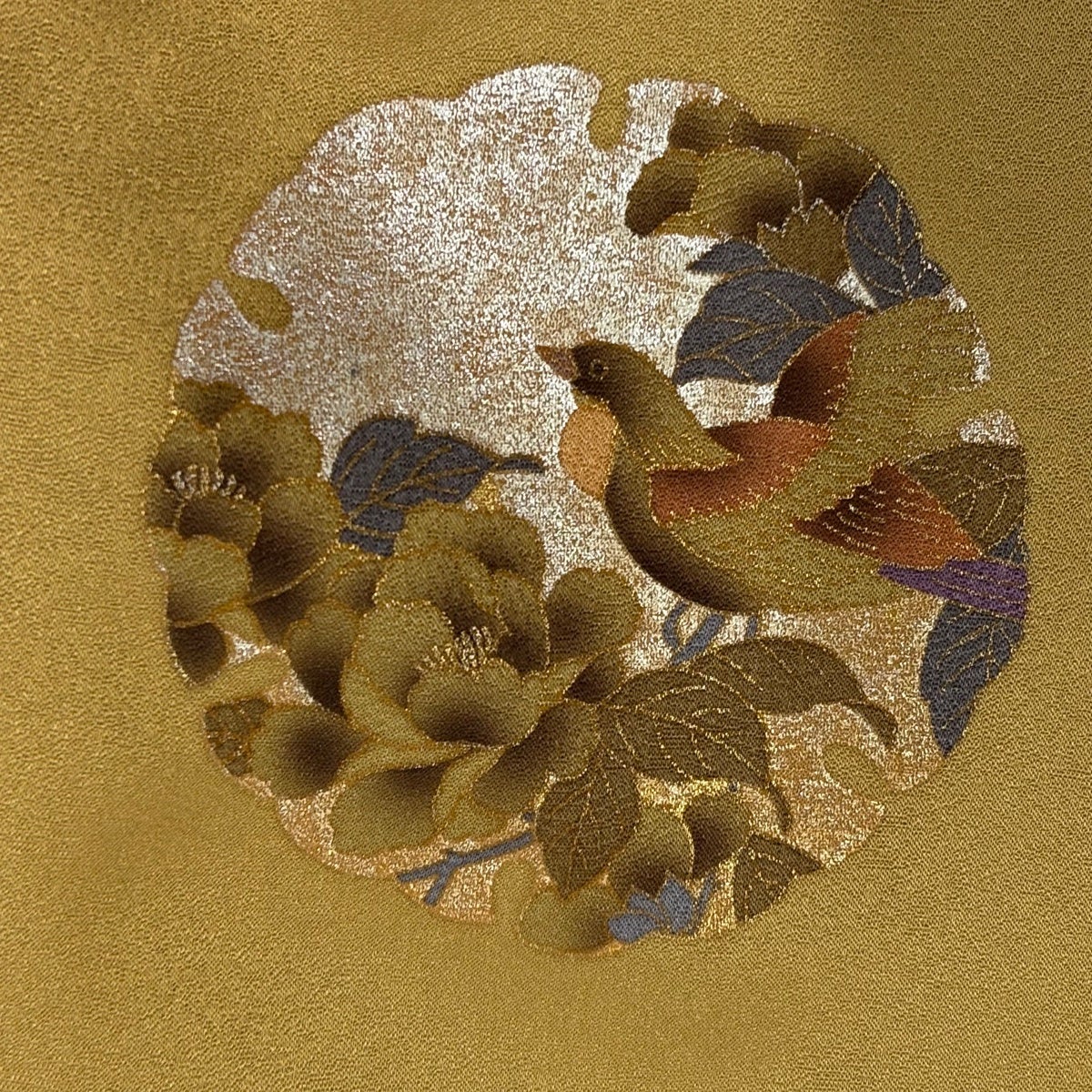 振袖 身丈169cm 裄丈68cm L 袷 花喰鳥 草花 金糸 金銀彩 黄土色 正絹 名品