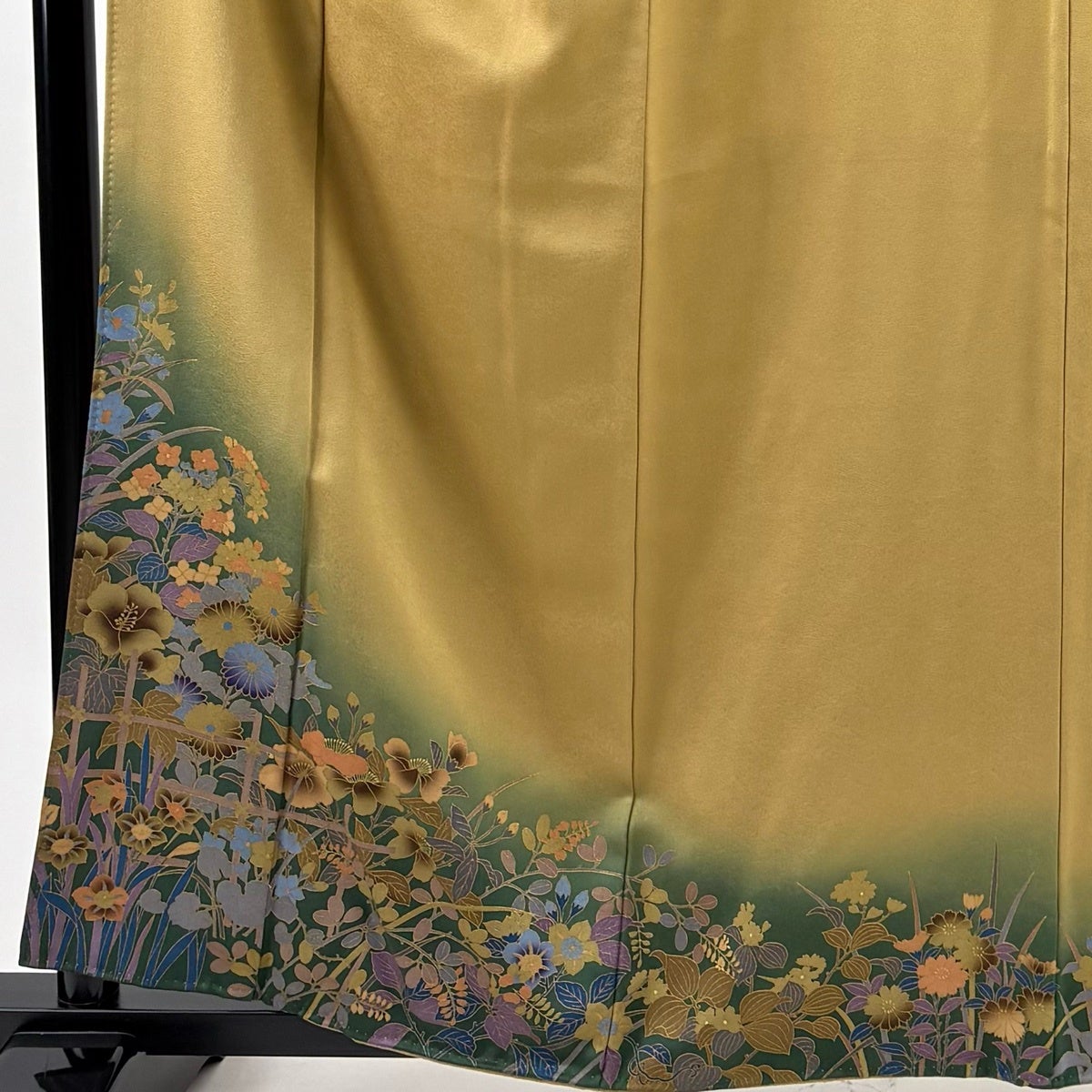 付下げ 身丈160.5cm 裄丈63.5cm S 袷 草花 金彩 染め分け 黄土色 正絹 秀品