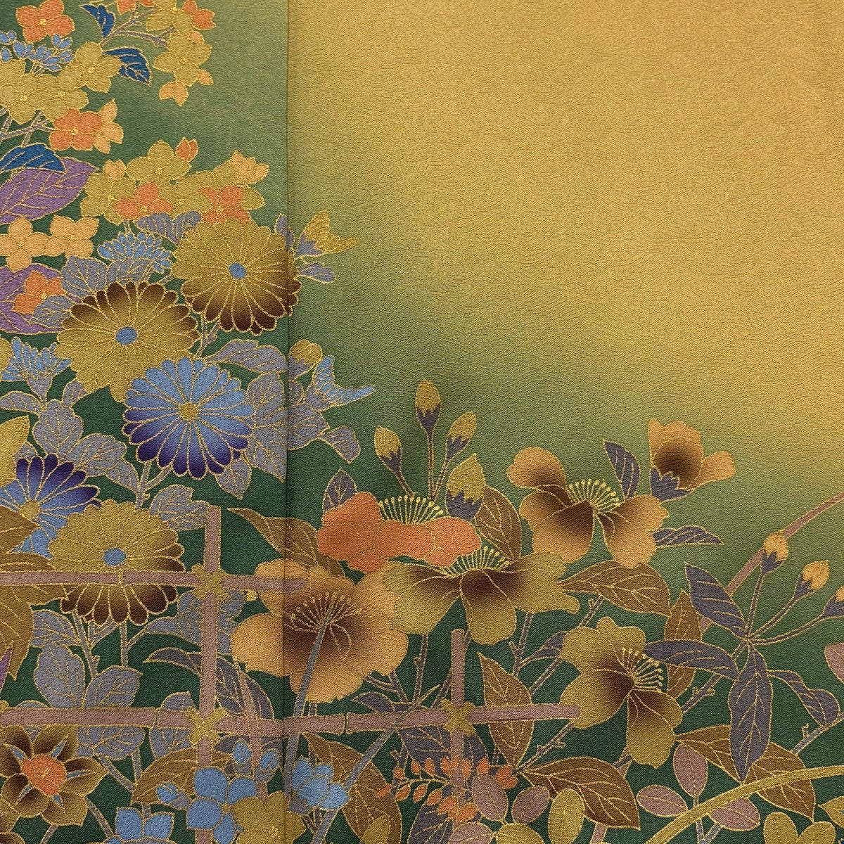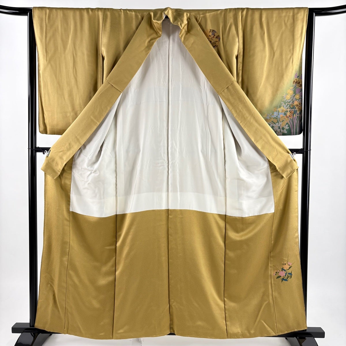 振袖 身丈166cm 裄丈69cm L 袷 御所車 草花 金彩 ぼかし 黄土色 正絹 名品