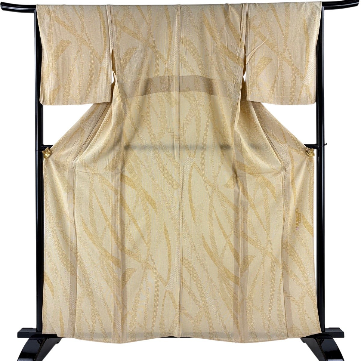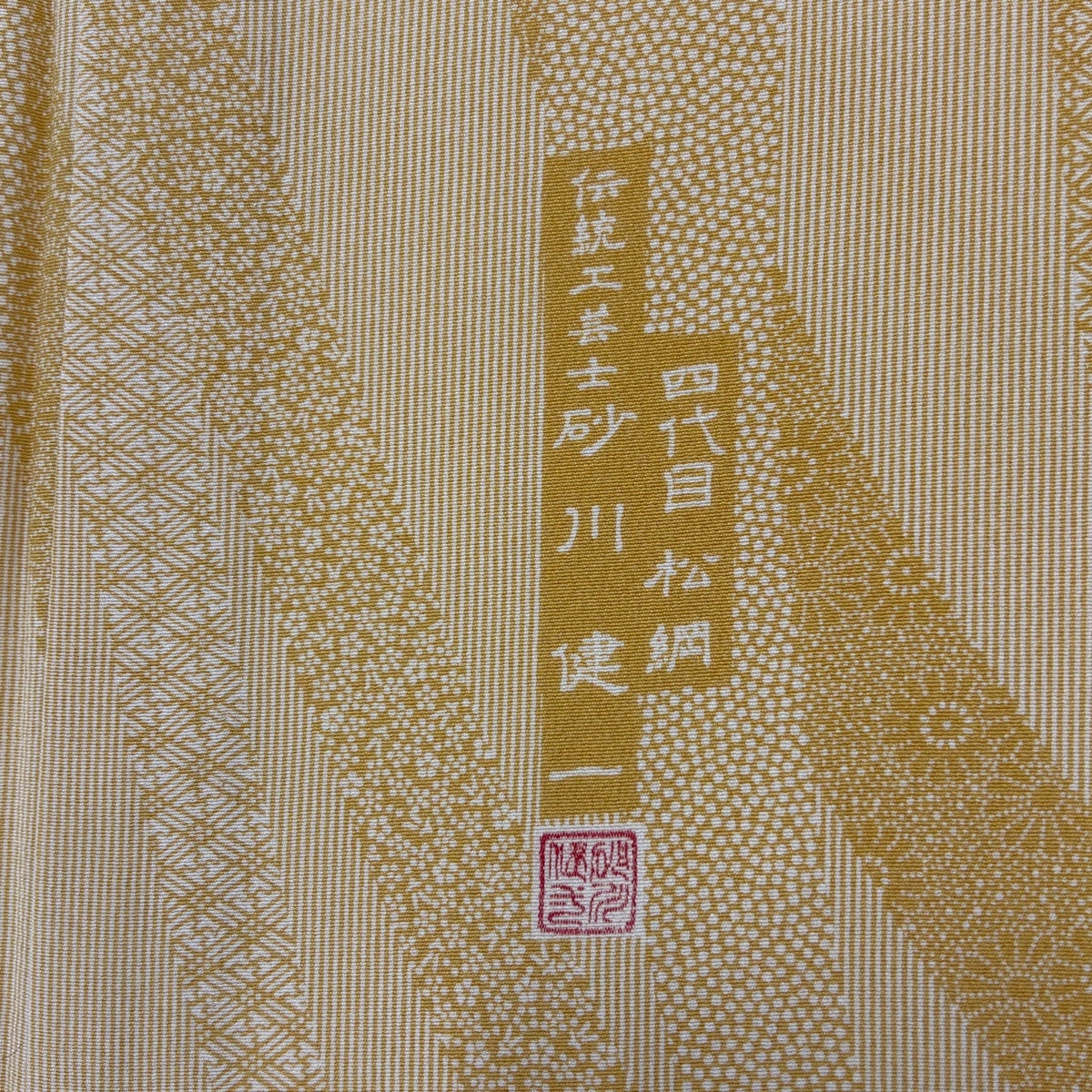 小紋 身丈160cm 裄丈66.5cm M 単衣 落款あり 蔓帯 縦縞 黄土色 正絹 秀品