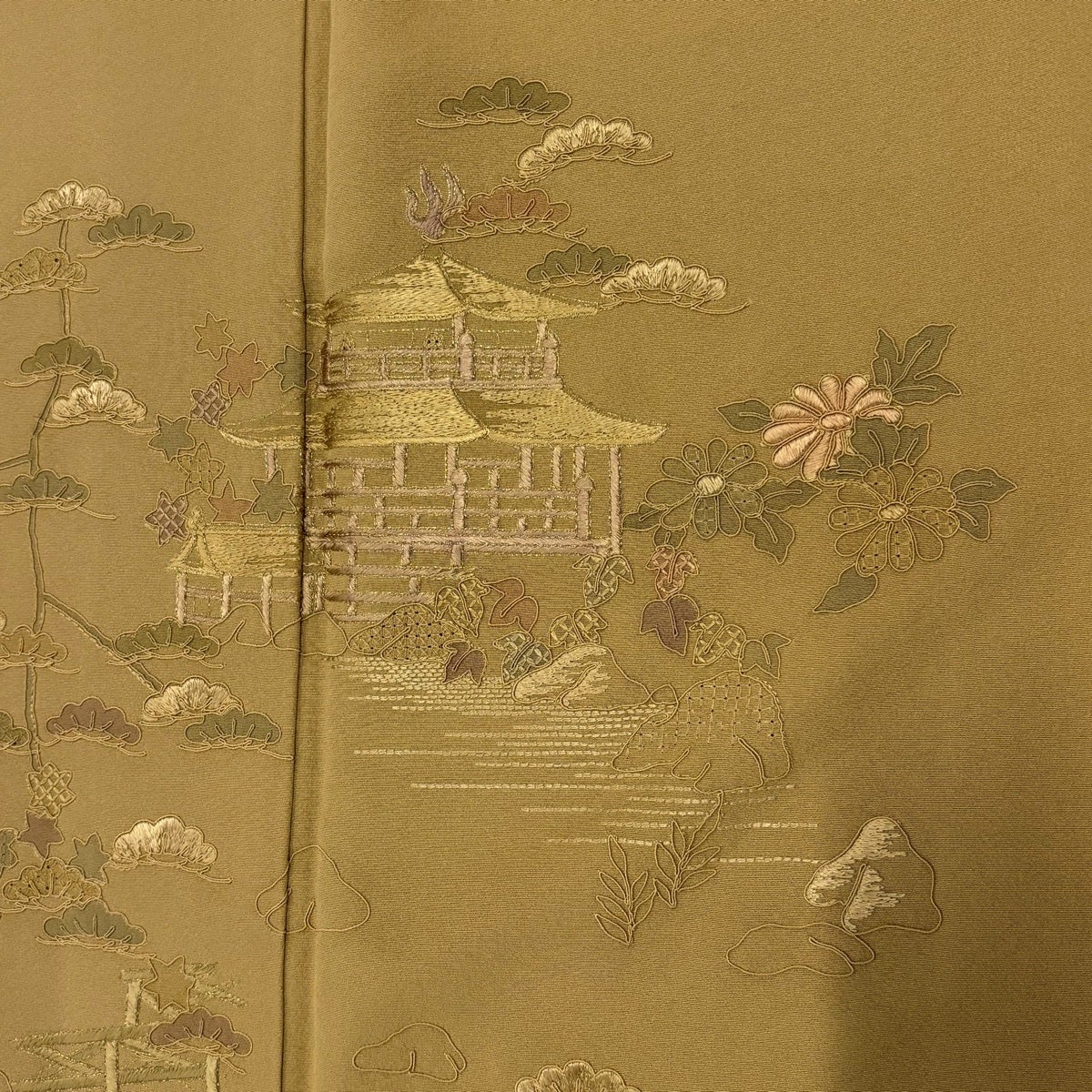 付下げ 身丈153cm 裄丈61.5cm S 袷 やまと 草花 松葉 刺繍 金糸 黄土色 正絹 秀品