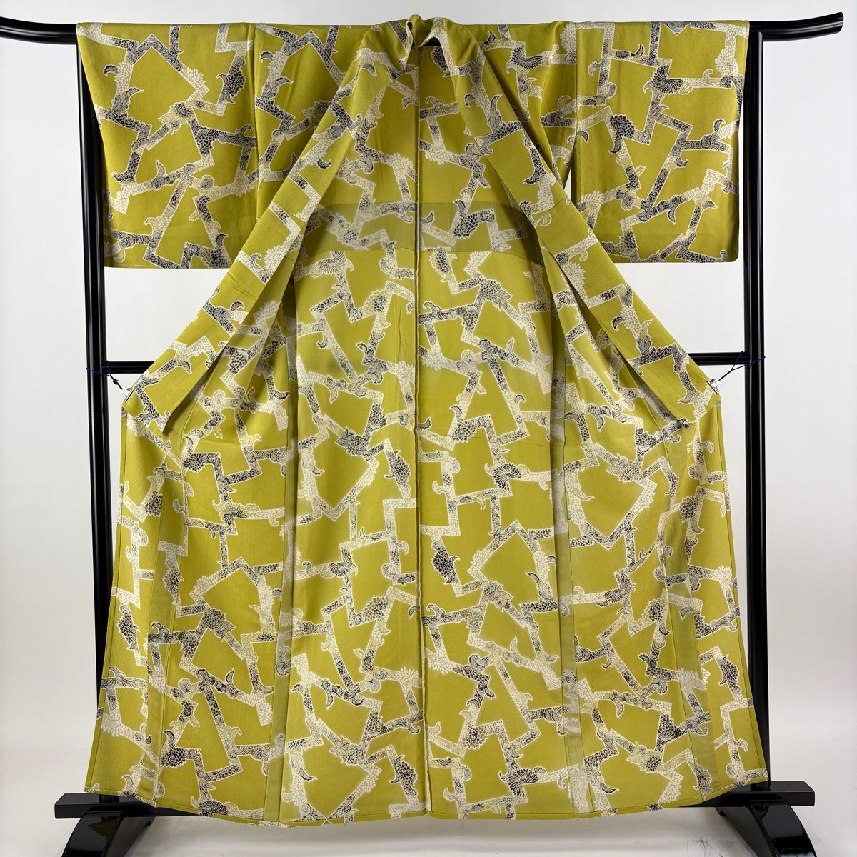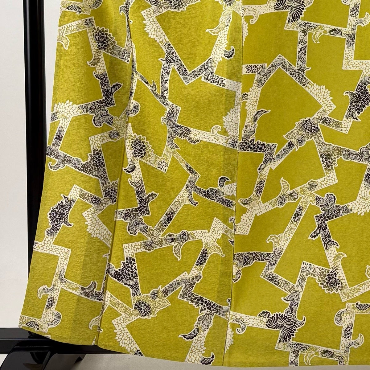 30%OFF 小紋 身丈160cm 裄丈65cm M 単衣 菊 幾何学 ちりめん 黄緑色 正絹 秀品 K30
