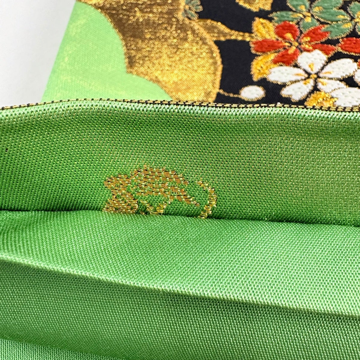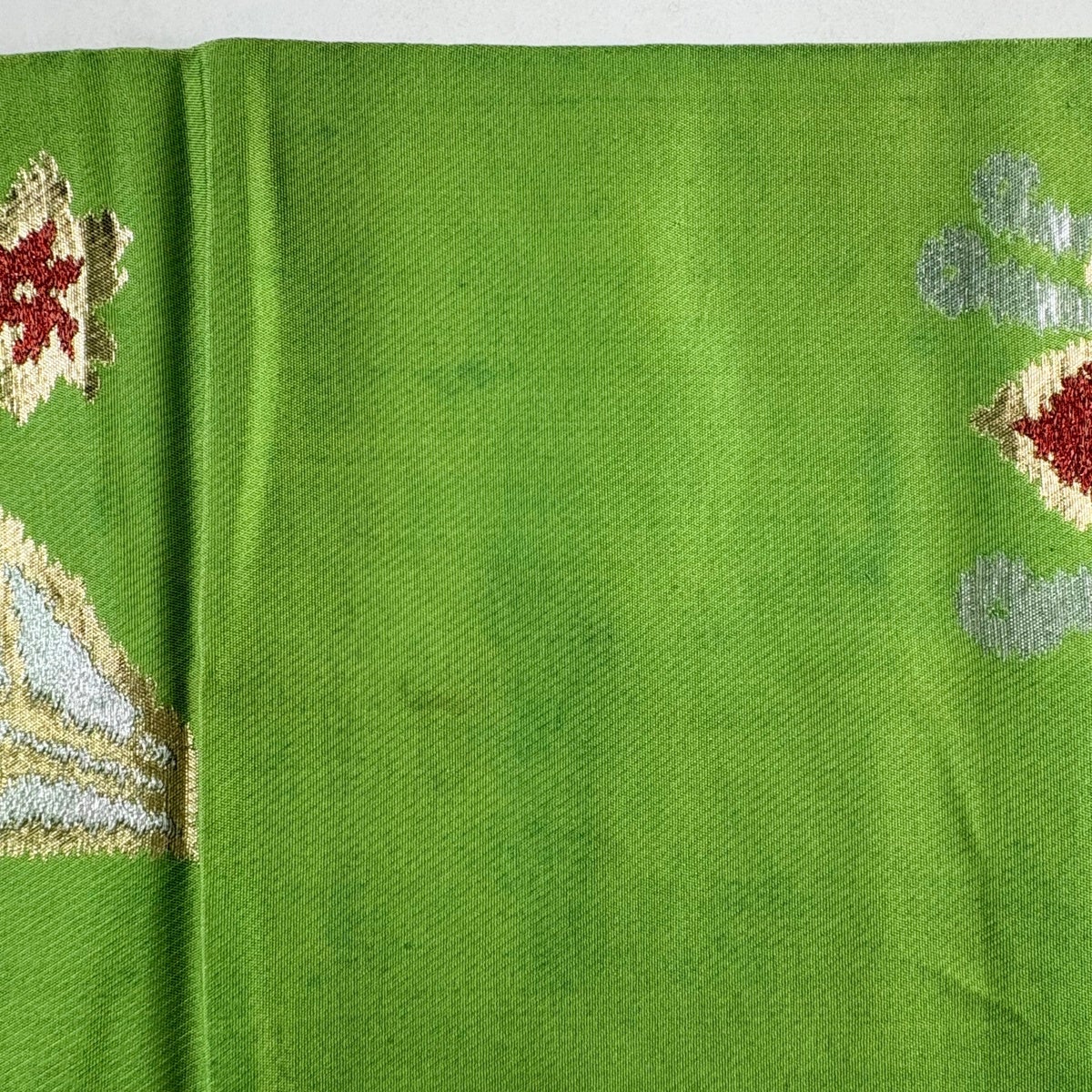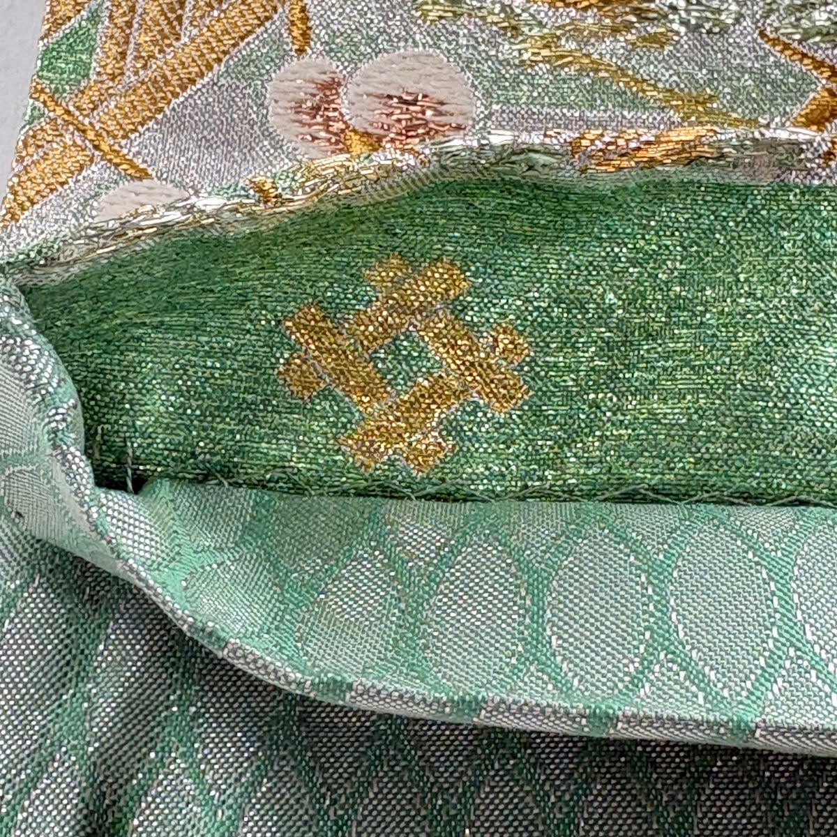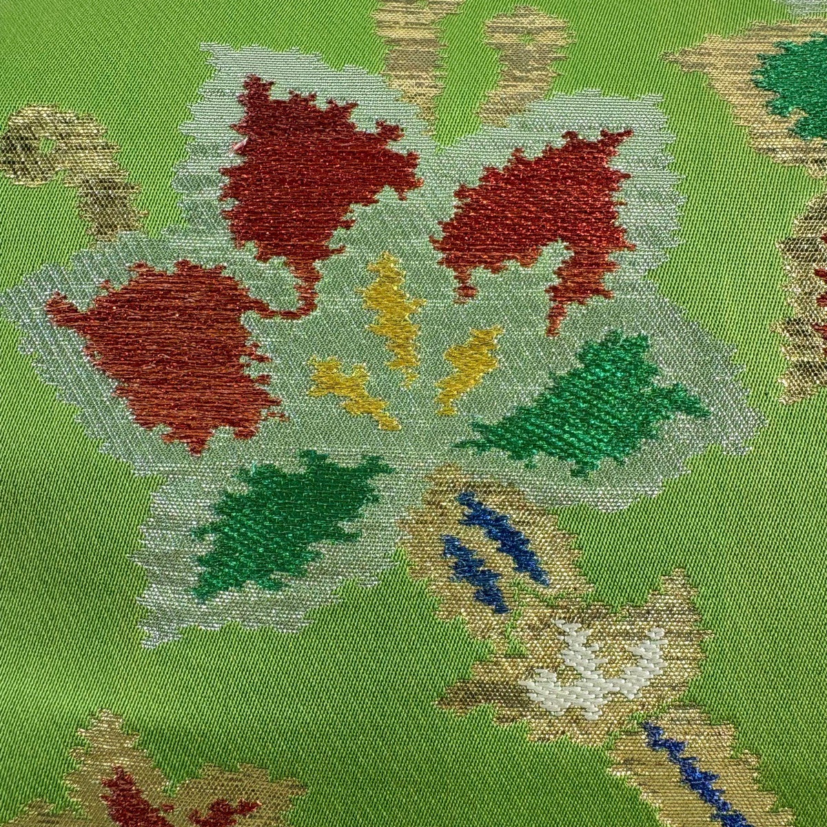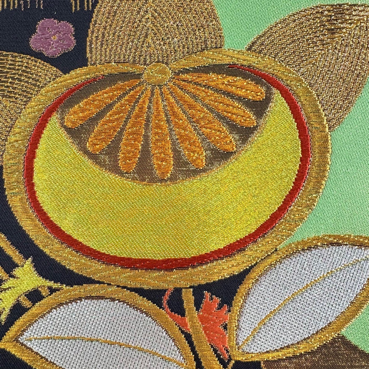 50%OFF 【美品】 袋帯 秀品 鈴乃屋 花 幾何学模様 箔 黄緑色 六通 正絹 K50
