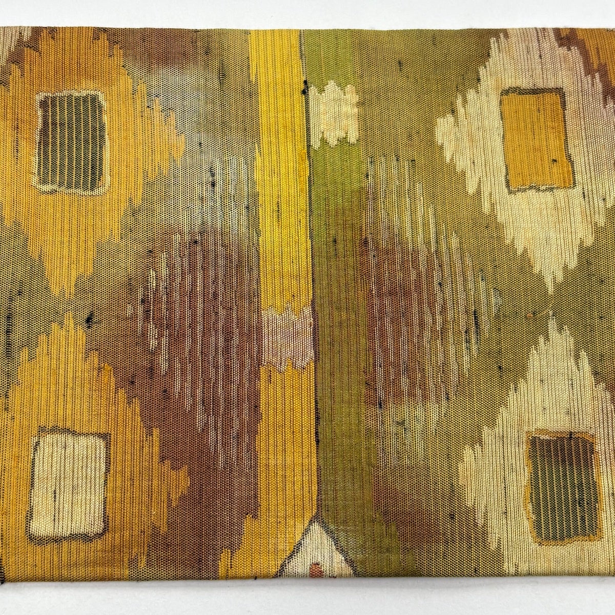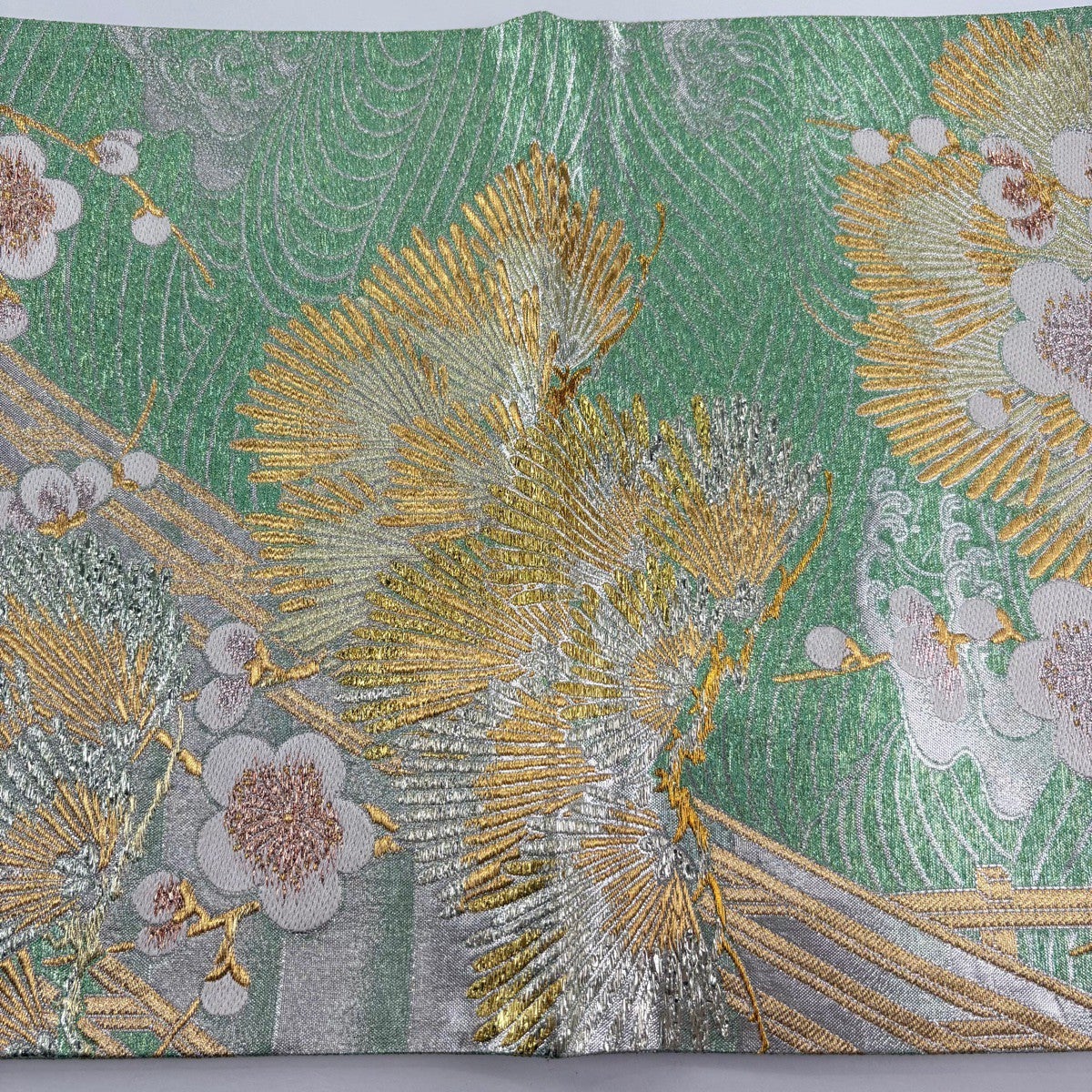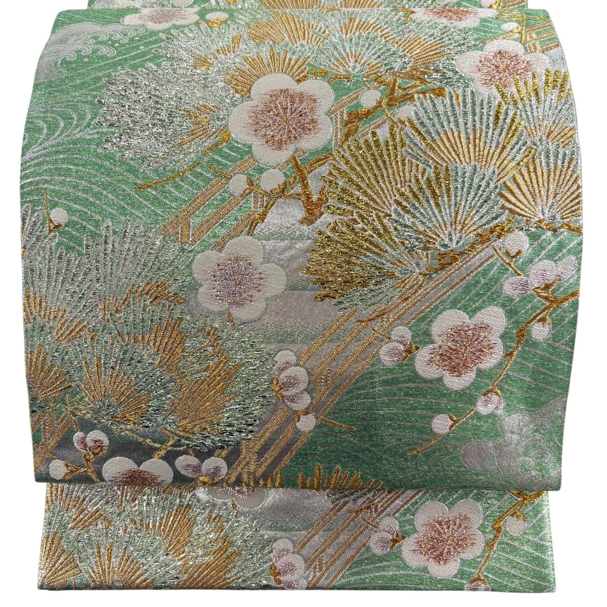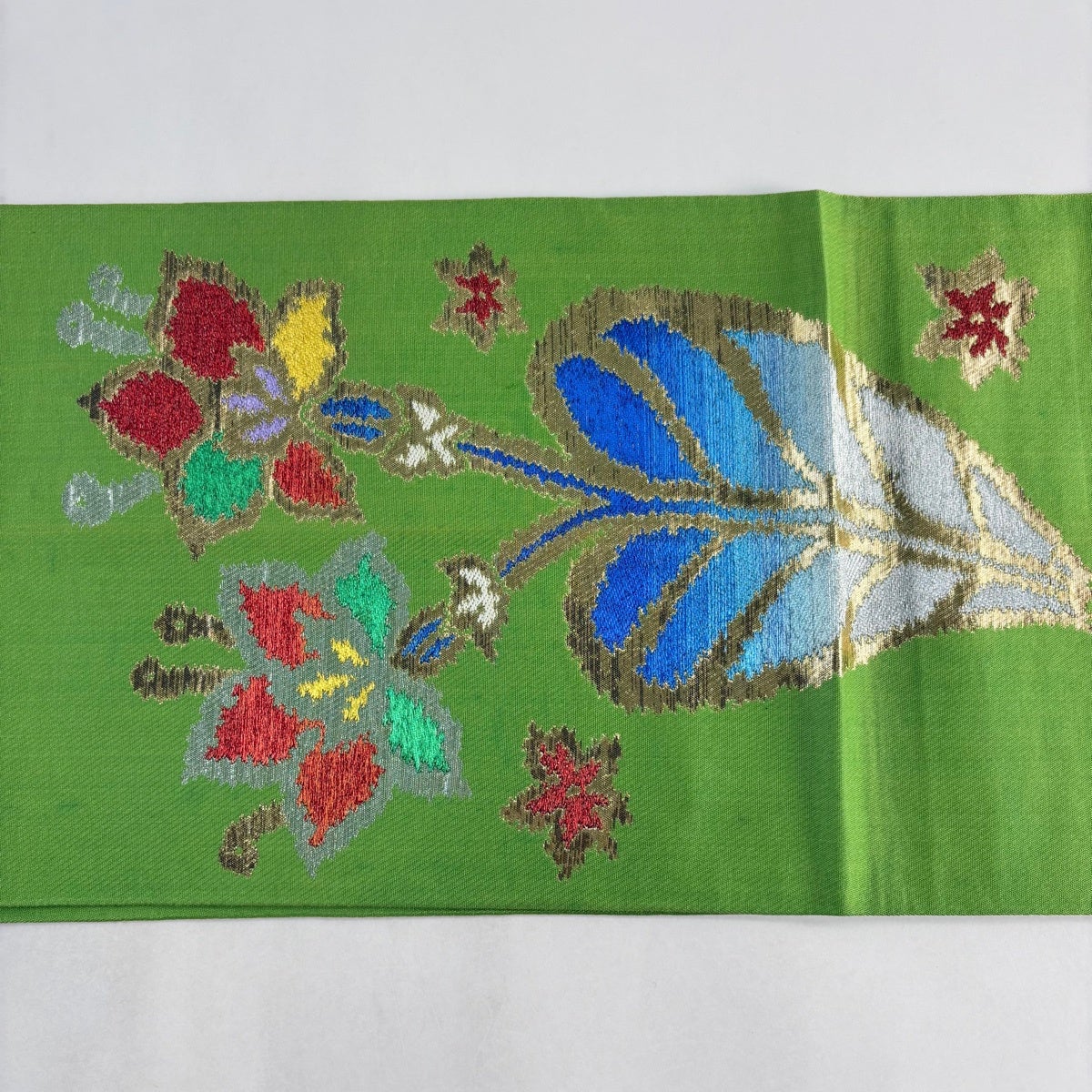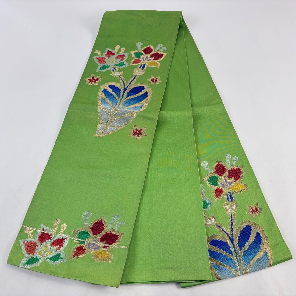 50%OFF 【美品】 袋帯 秀品 鈴乃屋 花 幾何学模様 箔 黄緑色 六通 正絹 K50