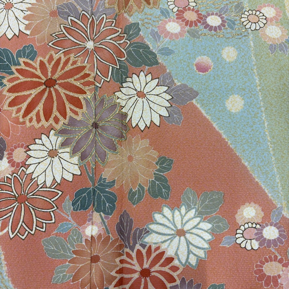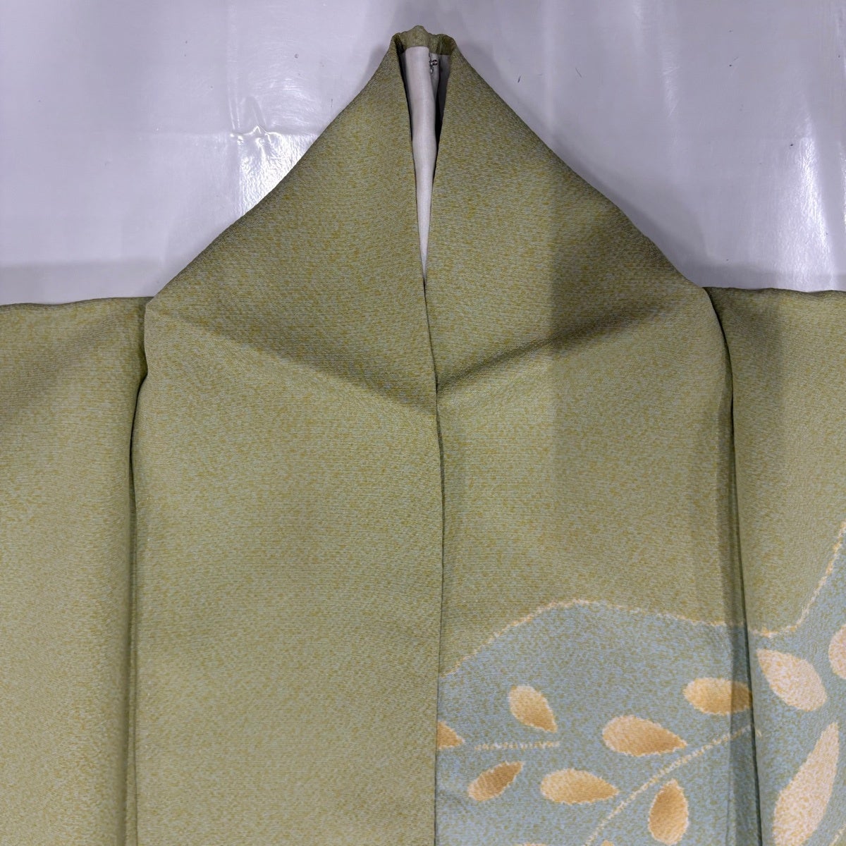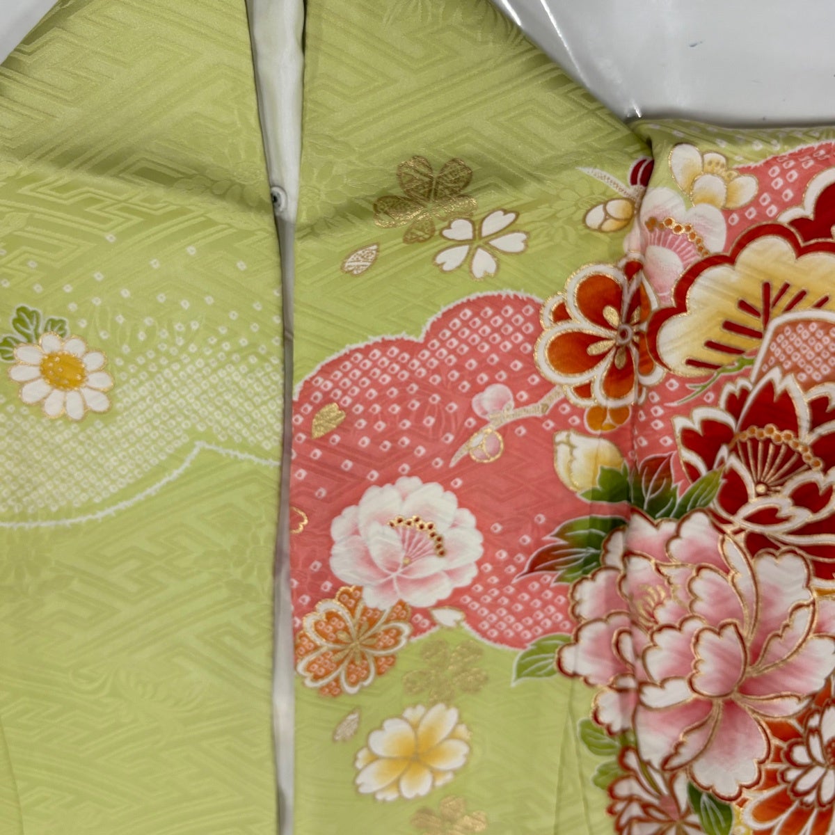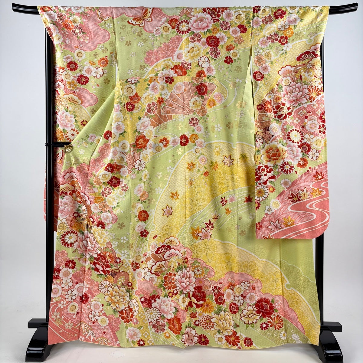 50%OFF 振袖 身丈163.5cm 裄丈64cm M 袷 扇面 菊 総絞り 金糸 黄緑色 正絹 秀品 K50