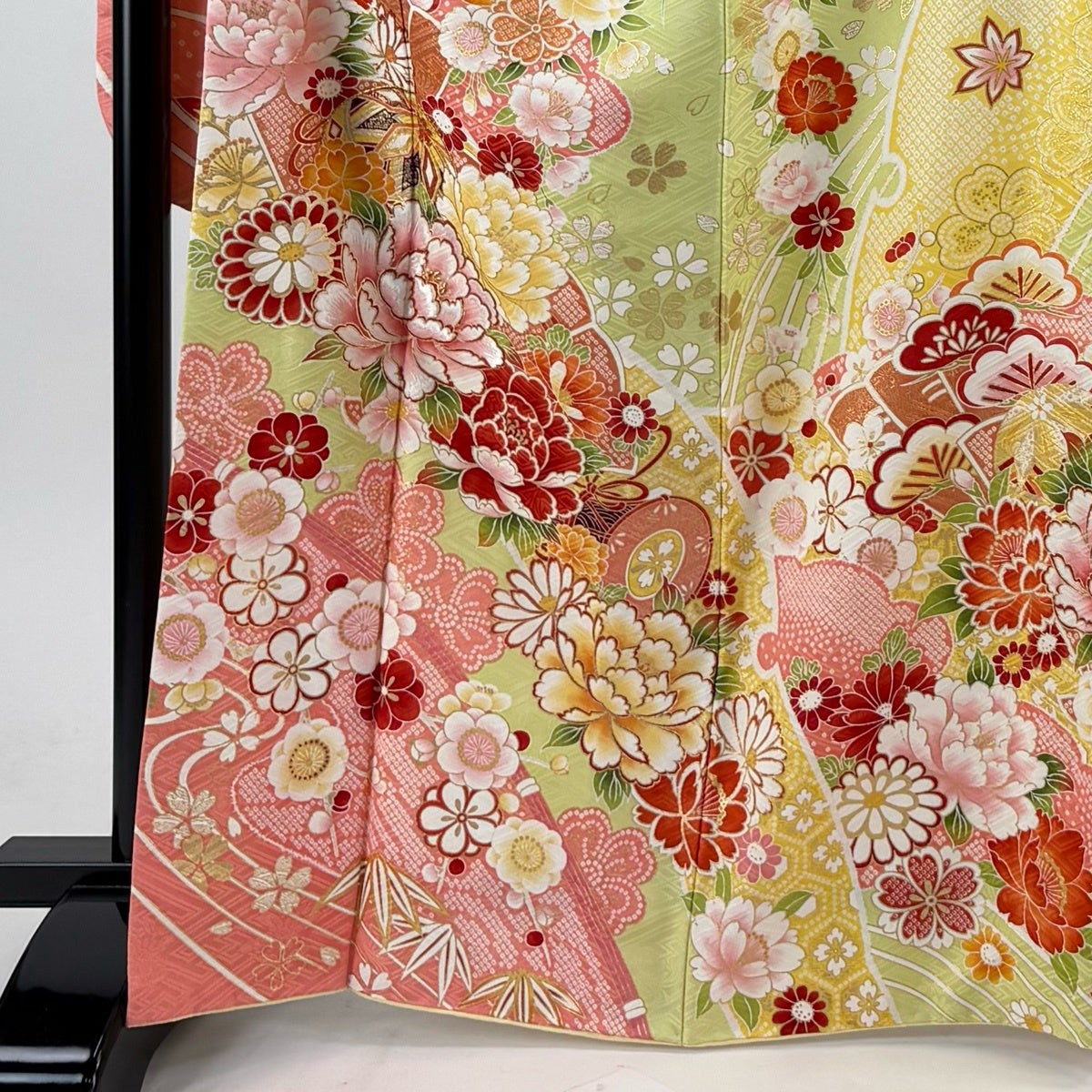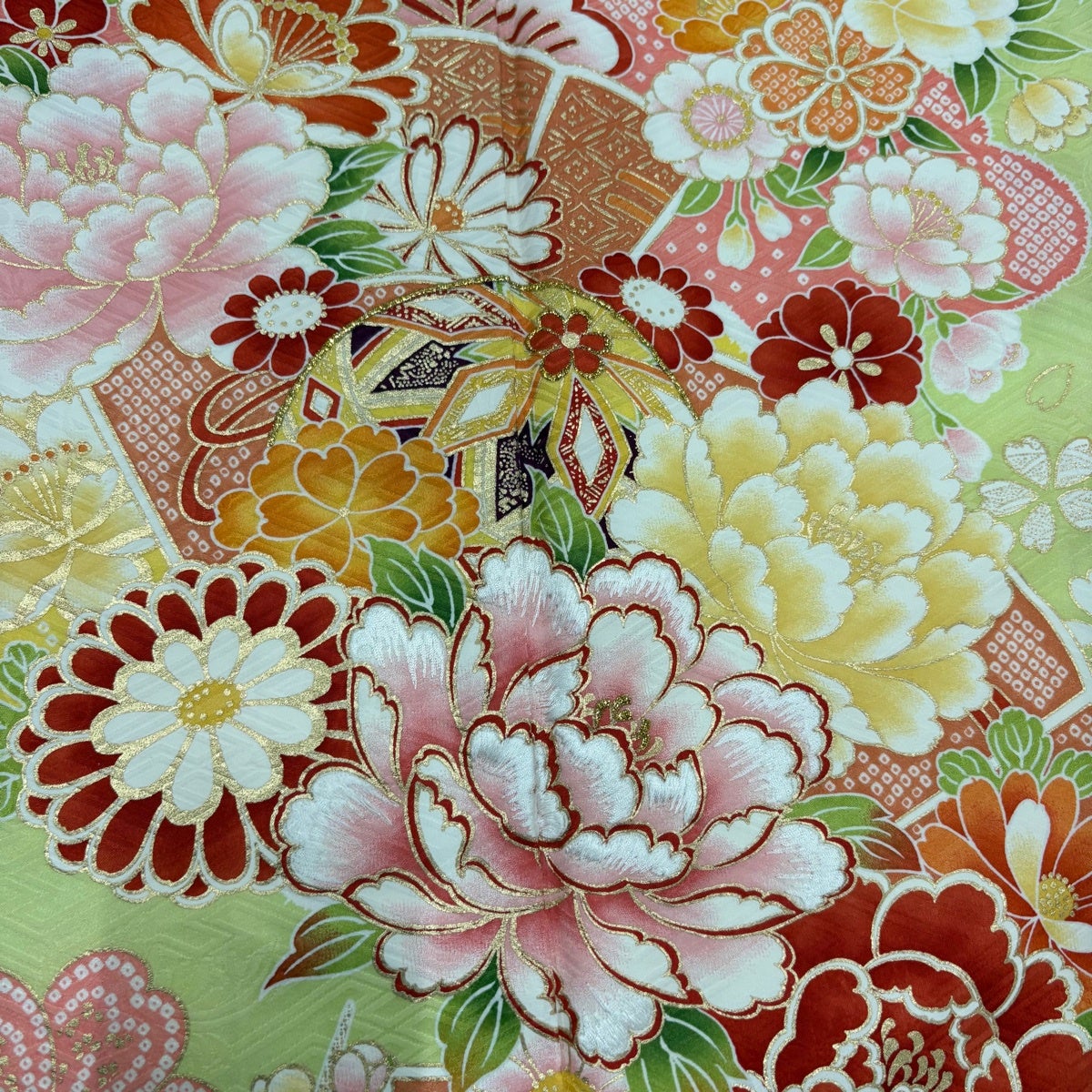 【美品】 振袖 身丈166.5cm 裄丈70cm L 袷 牡丹 手鞠 箔 金彩 黄緑色 正絹 名品