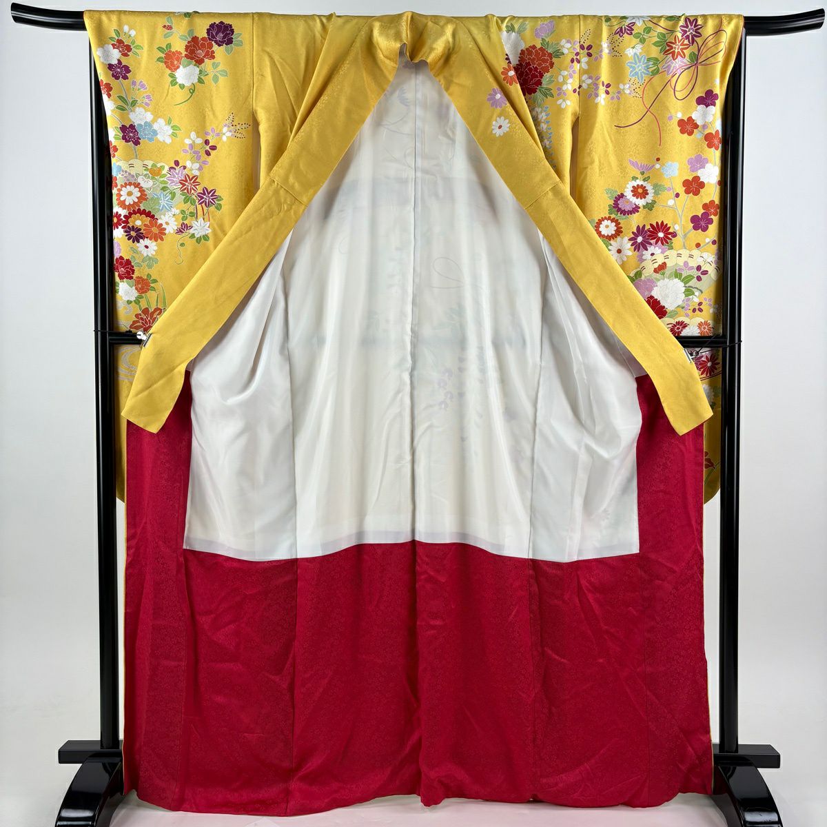 【最終価格】 70%OFF 振袖 身丈159.5cm 裄丈68cm L 袷 桜 梅 金通し 金彩 黄色 正絹 逸品 K70