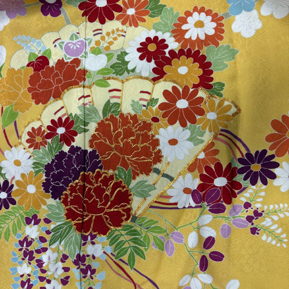 【在庫一掃】 振袖 身丈155.5cm 裄丈67cm M 袷 桜 桜の花びら 金糸 金彩 黄色 正絹 名品