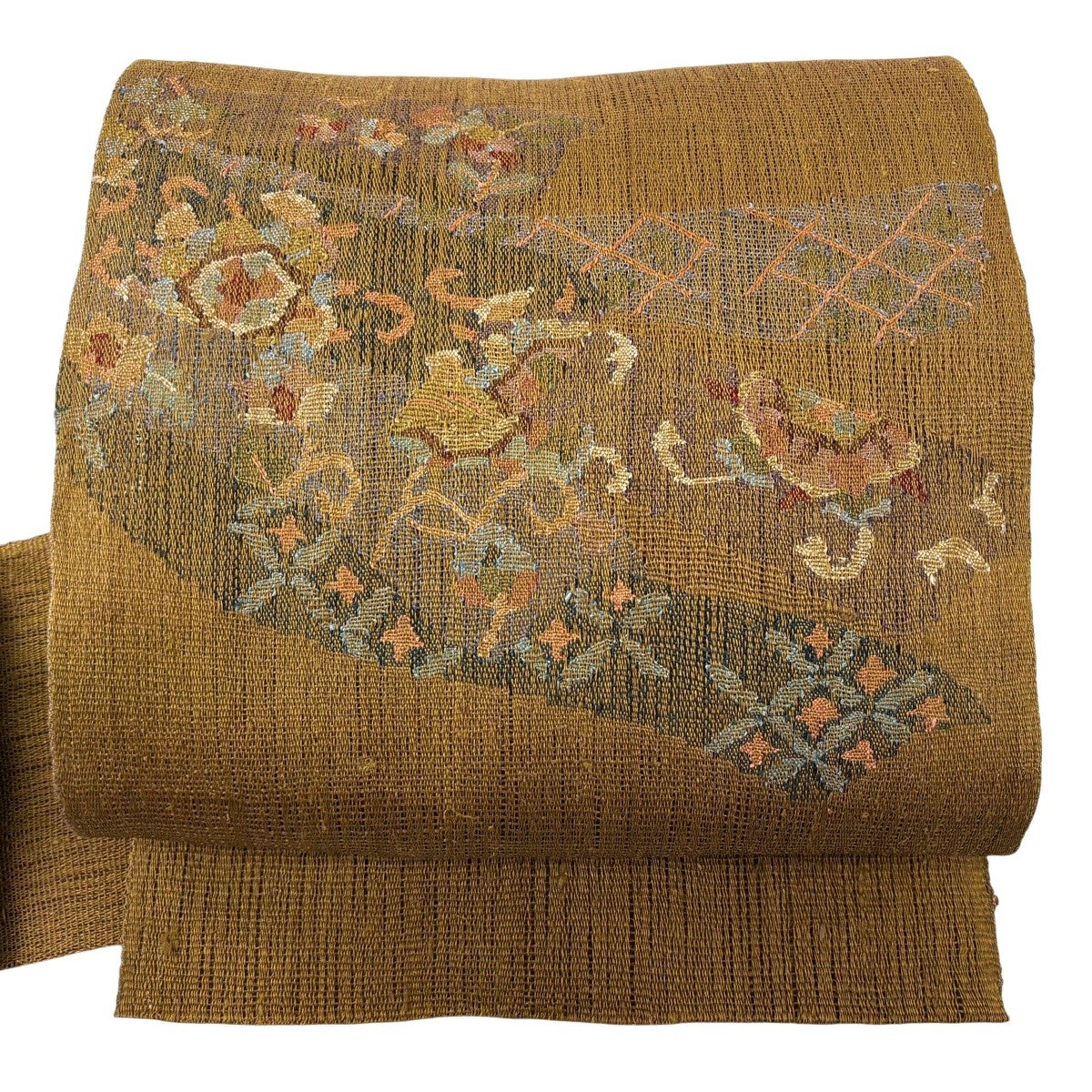【美品】 袋帯 秀品 紬地 花 菱 絞り 山吹茶色 お太鼓柄 正絹