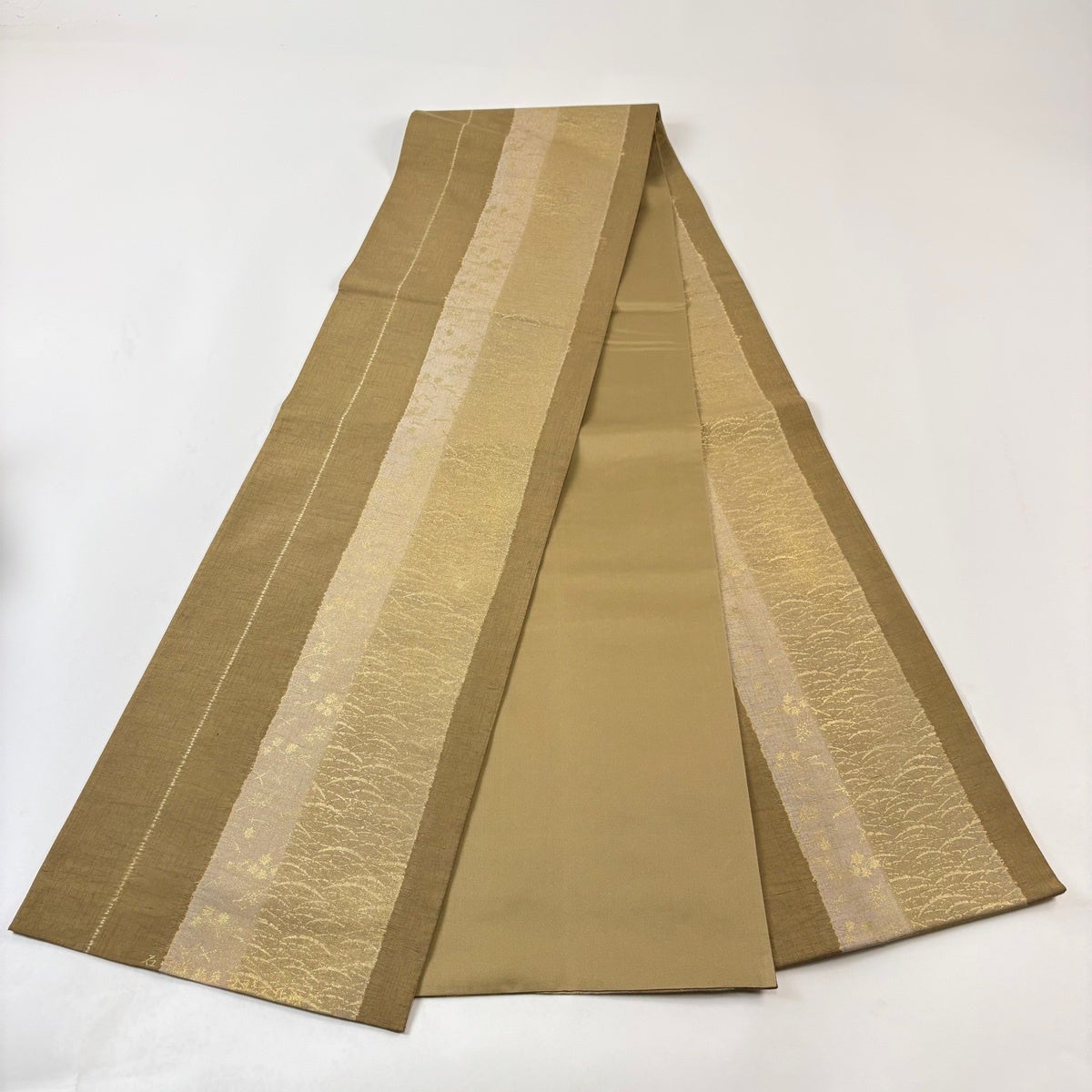 【美品】 名古屋帯 秀品 落款あり 八寸名古屋帯 松葉仕立て 遠藤龍二 段縞 幾何学模様 草木染 黄土色 正絹
