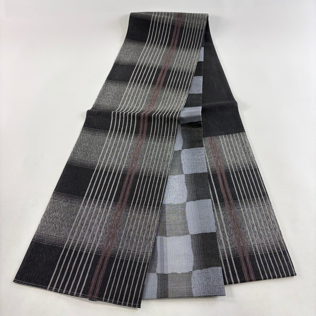 袋帯 秀品 変わり市松 縞 ラメ糸 黒灰 六通 正絹