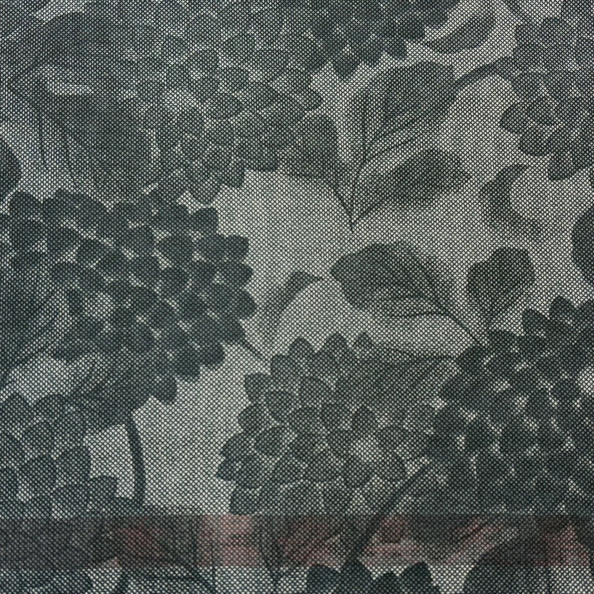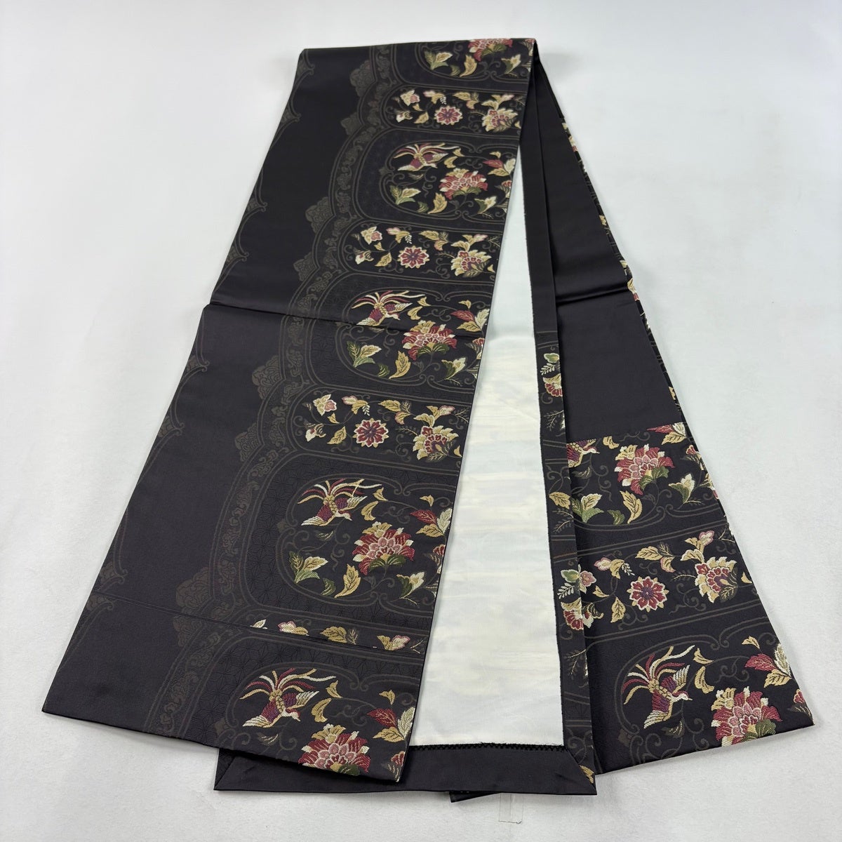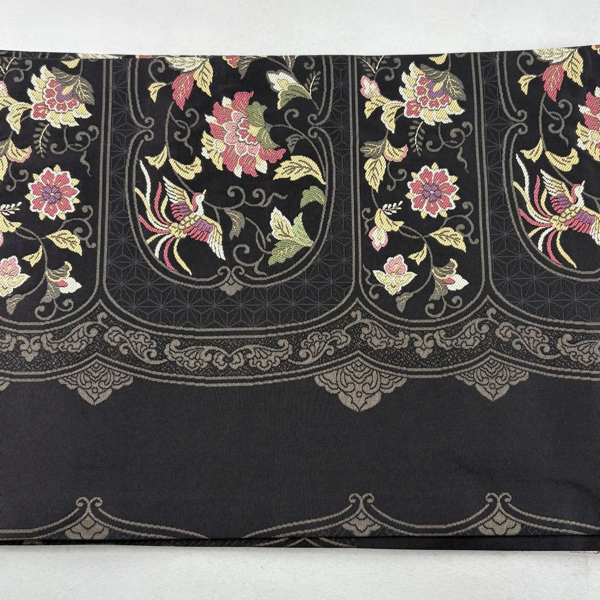 【美品】 開き名古屋帯 秀品 花鳥 花唐草 黒灰 正絹