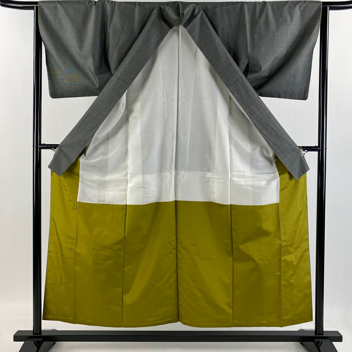 50%OFF 色留袖 身丈163.5cm 裄丈66.5cm M 袷 幾何学 縞 金糸 金彩 黒灰 正絹 秀品 一つ紋 K50