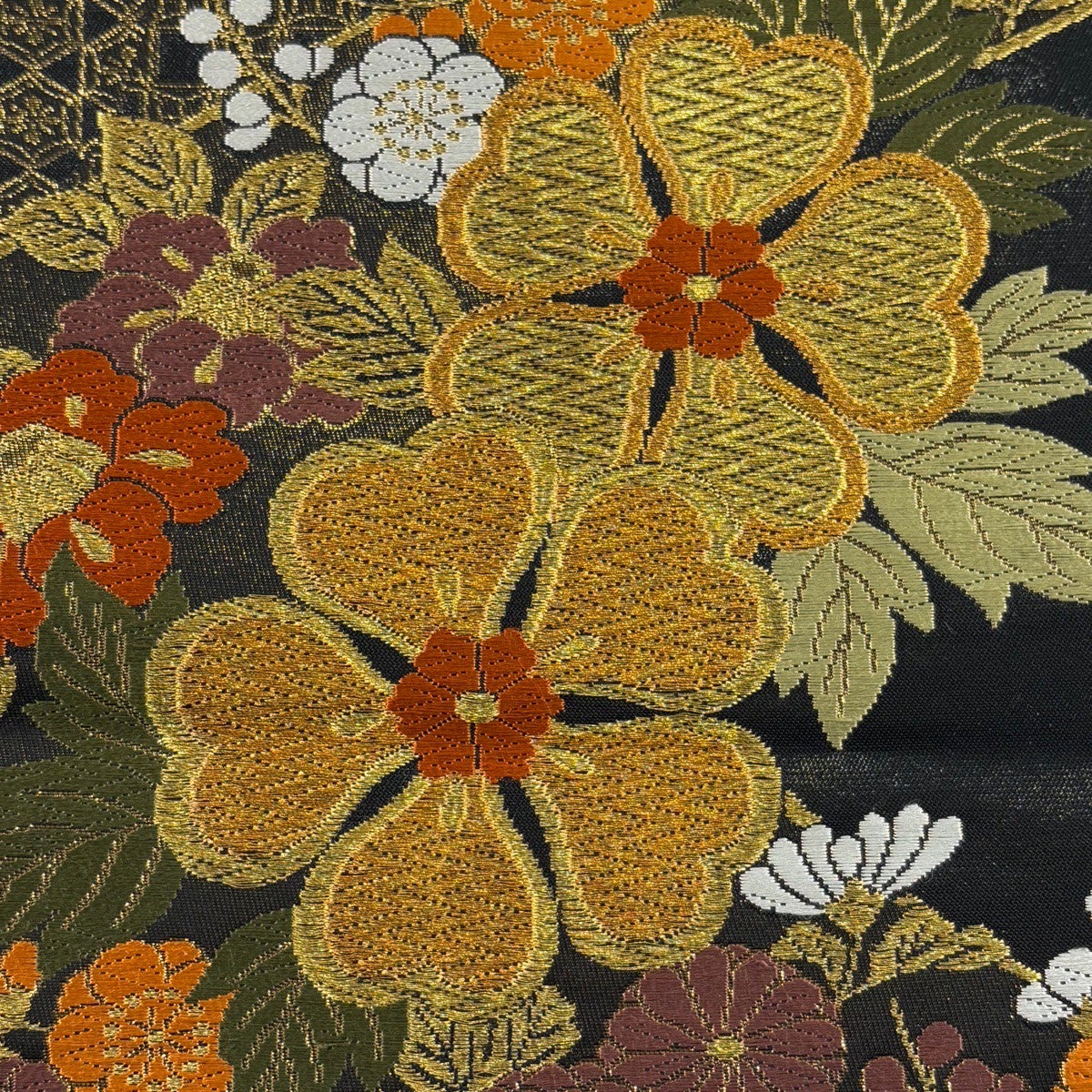 袋帯 秀品 桜 椿 金糸 唐織 黒 六通 正絹
