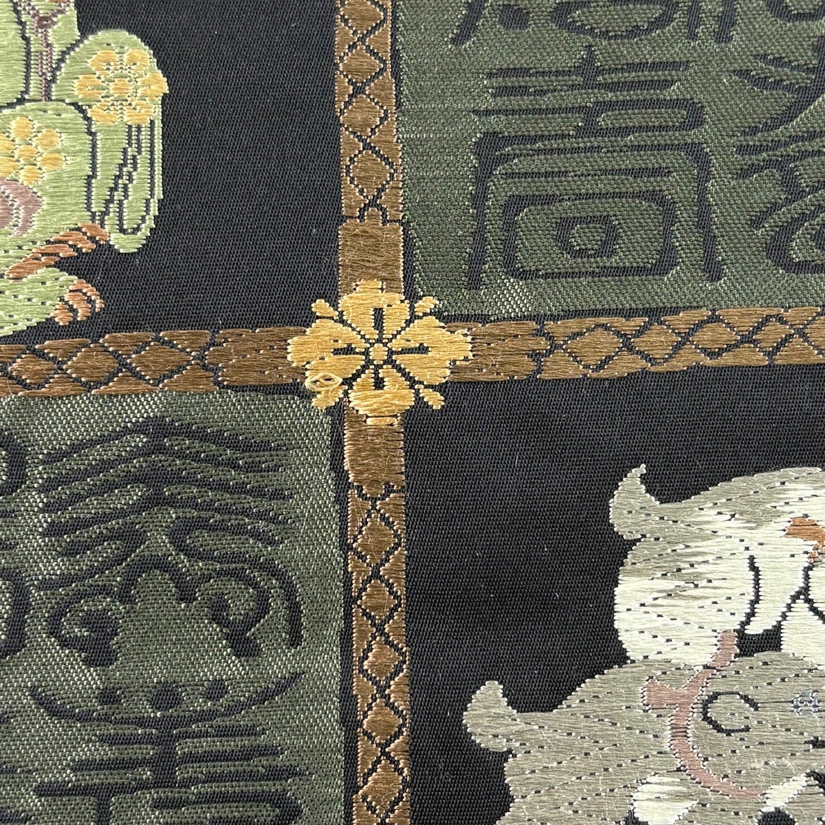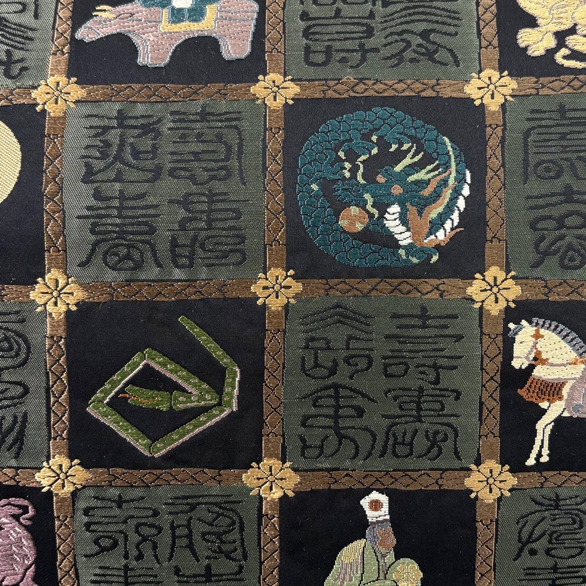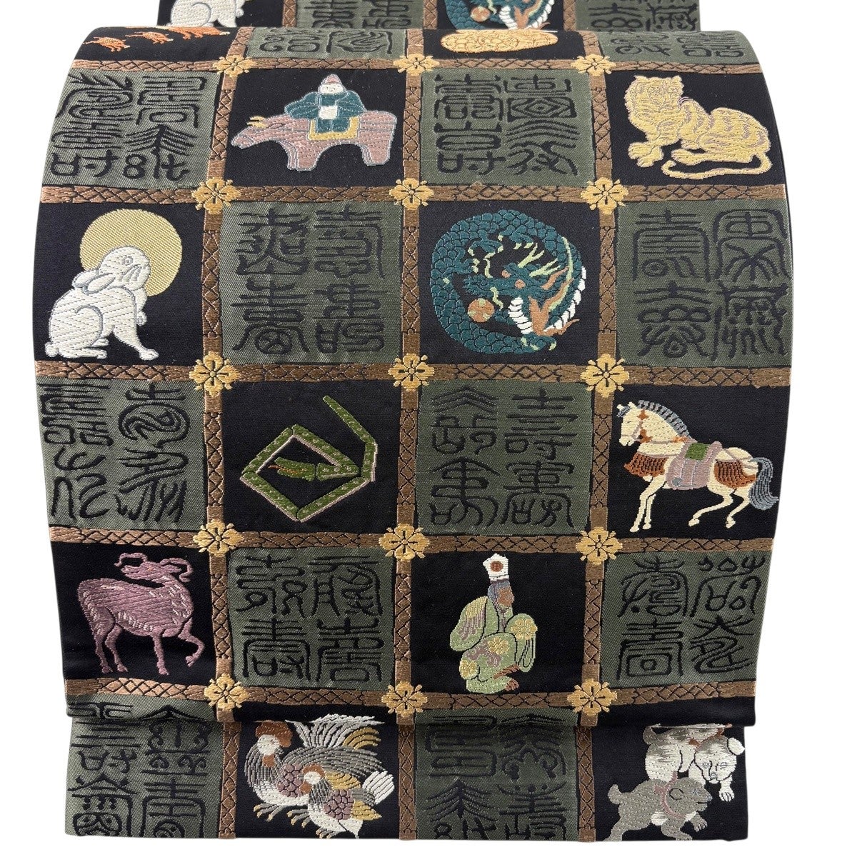 袋帯 逸品 動物 文字文 唐織 黒 六通 正絹