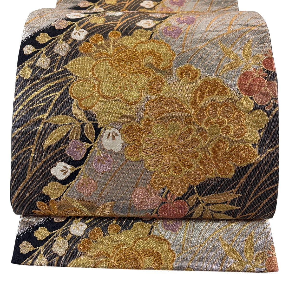 袋帯 秀品 草花 波 金糸 箔 墨色 六通 正絹