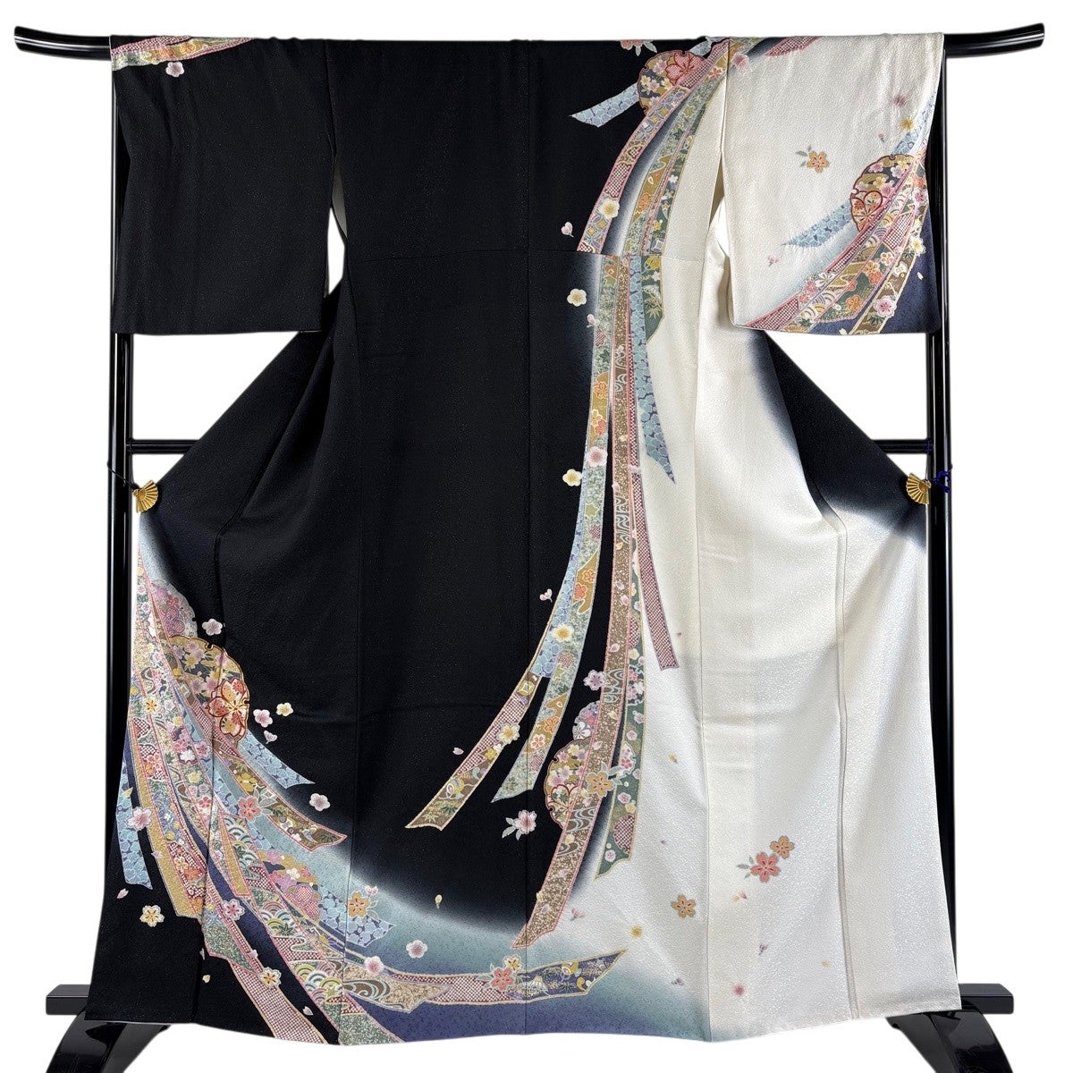 振袖 身丈162cm 裄丈66cm M 袷 雪輪 草花 染め分け 金彩 黒 正絹 名品
