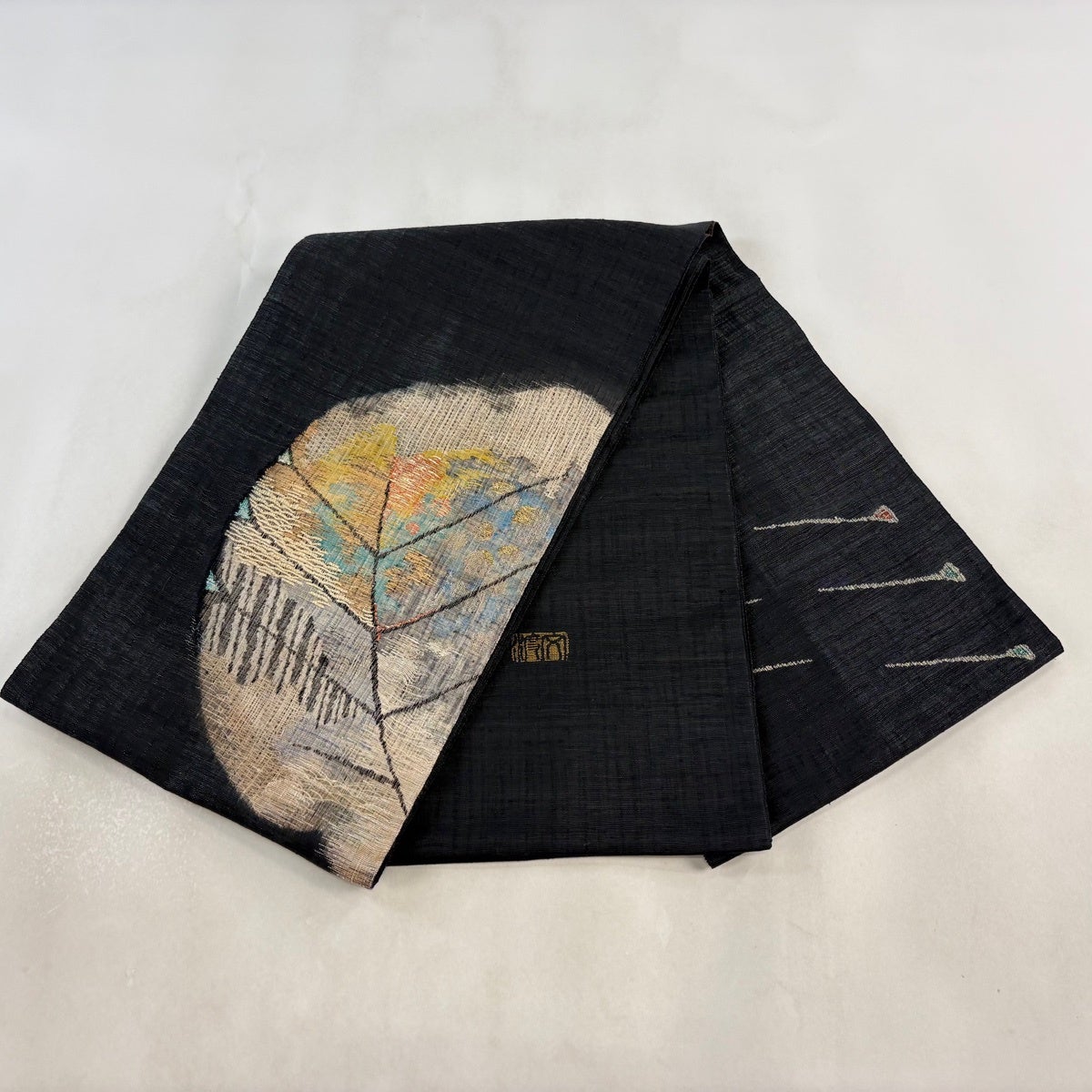 【美品】 袋帯 秀品 落款あり ヒロココシノ 草花 葉と実 唐織 箔 黒 六通 正絹