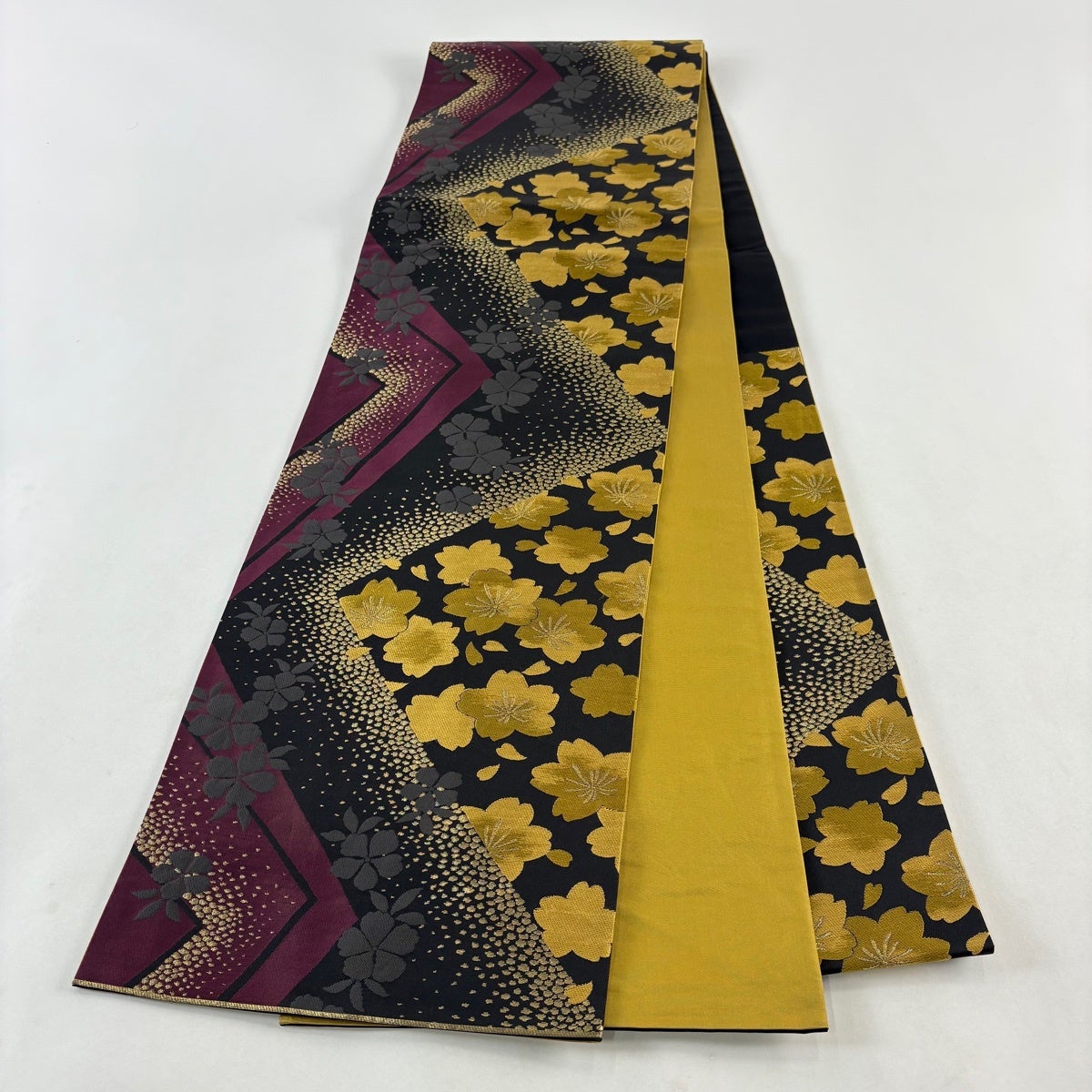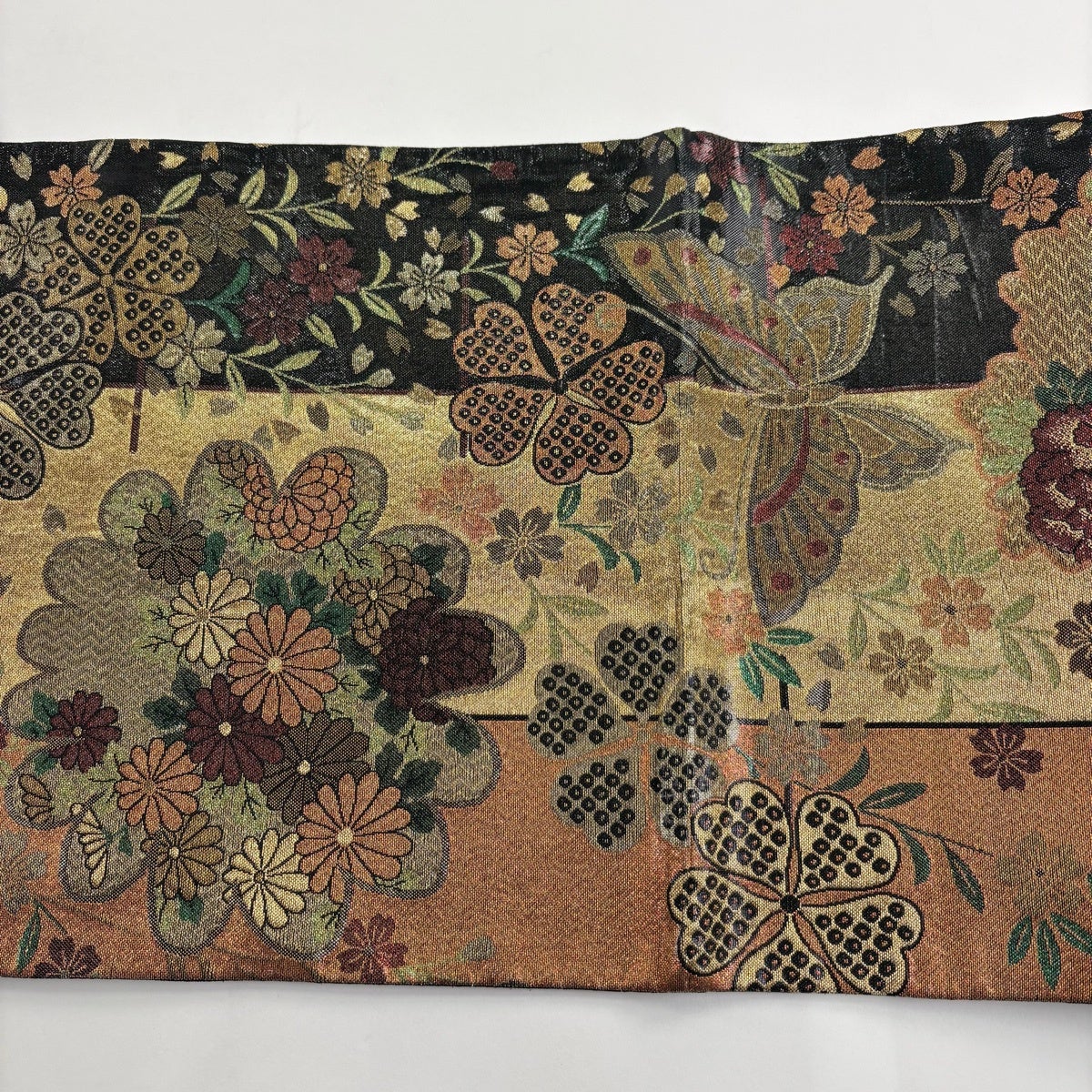 袋帯 秀品 桜 斜縞 金糸 箔 黒 六通 正絹