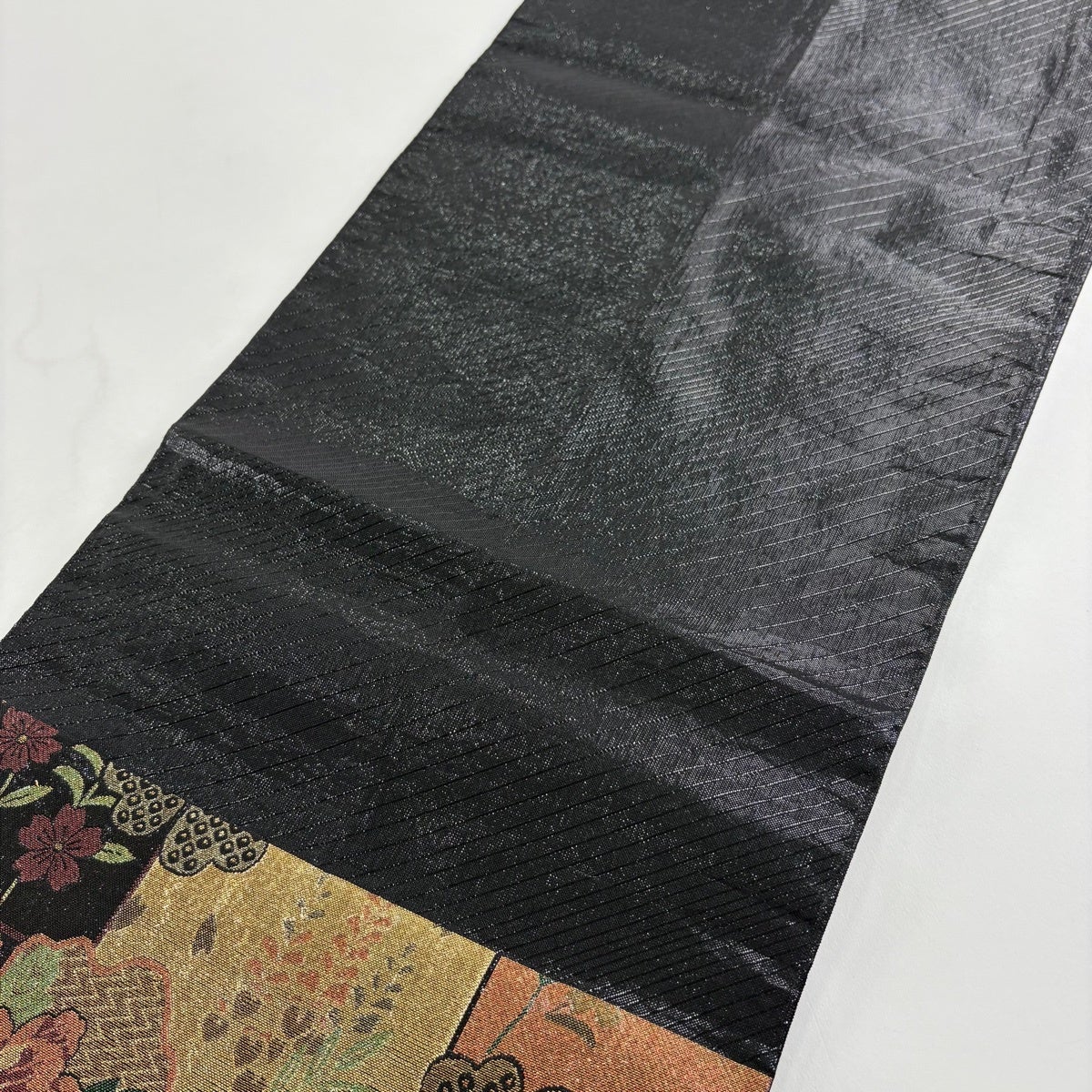 袋帯 逸品 草花 菱 刺子刺繍 黒 全通 正絹