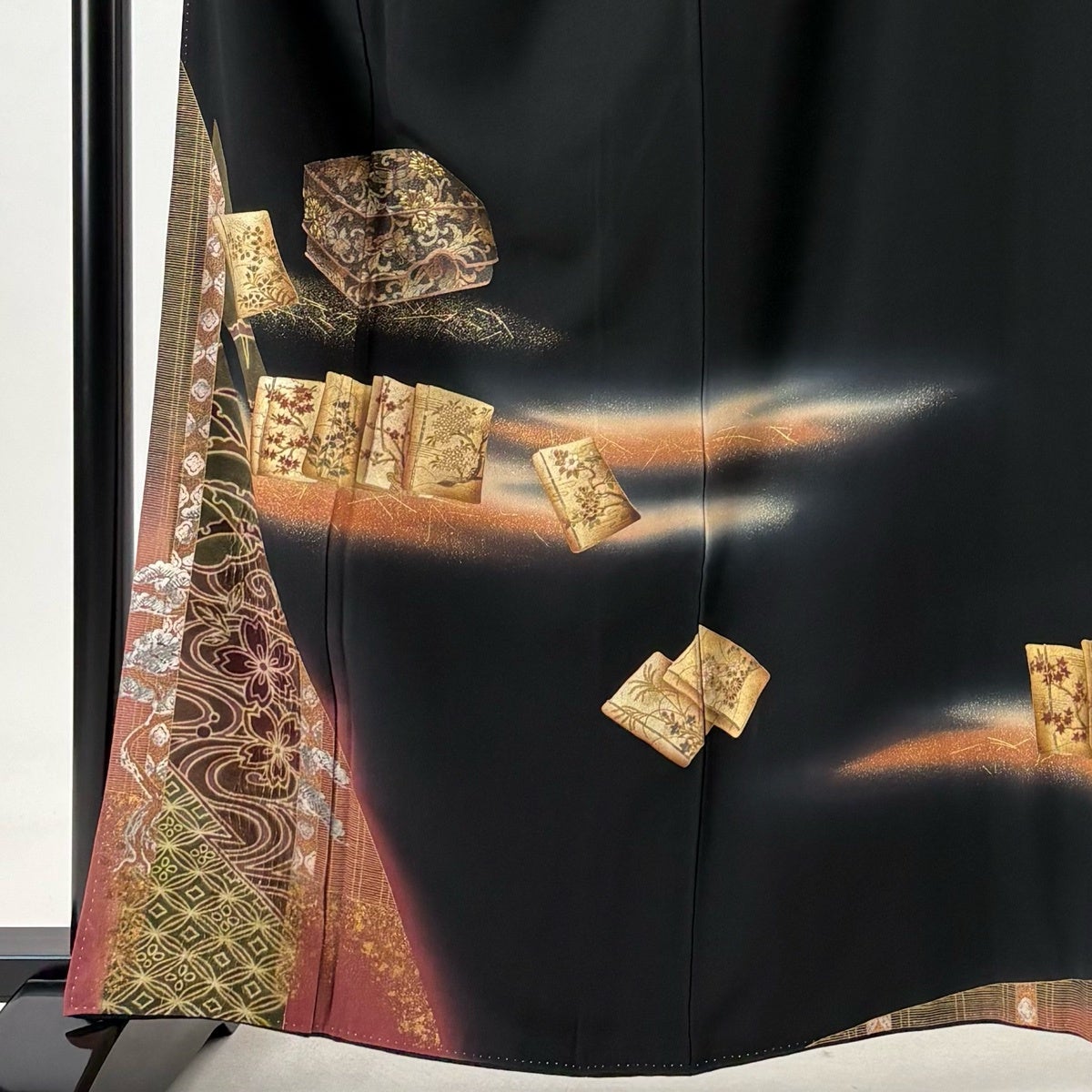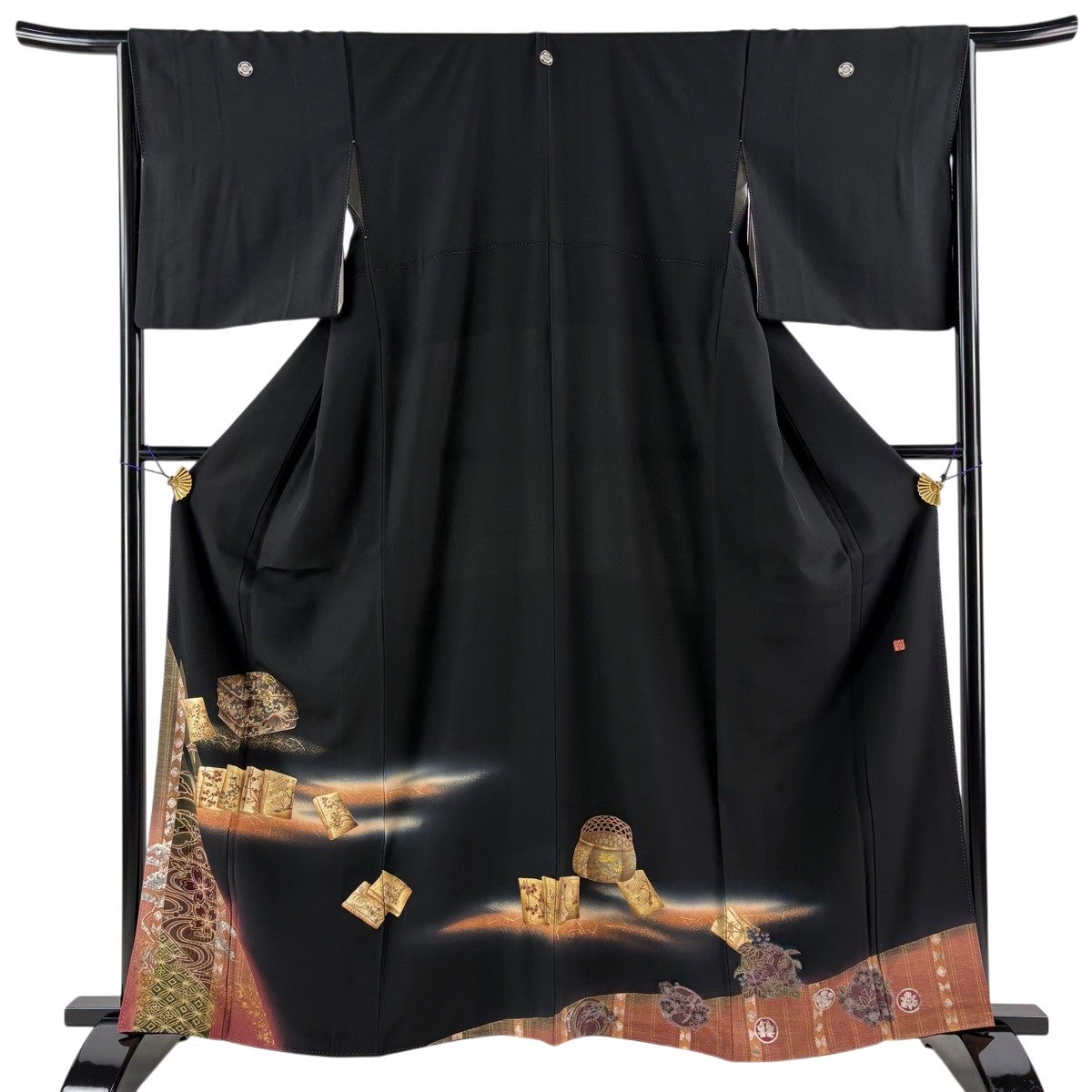 黒留袖 身丈161cm 裄丈65cm M 袷 落款あり 冊子 文箱 金銀彩 ぼかし 黒 正絹 優品