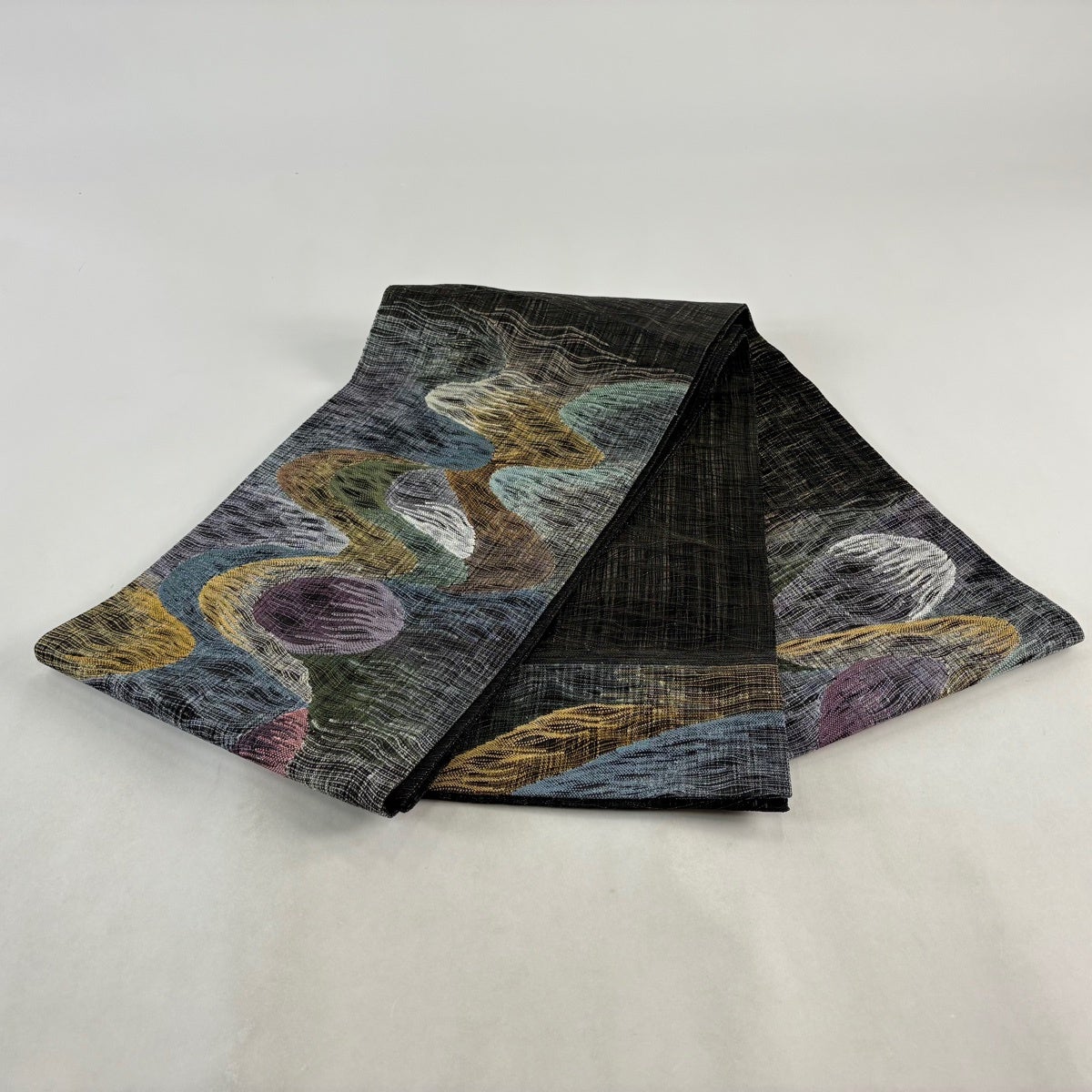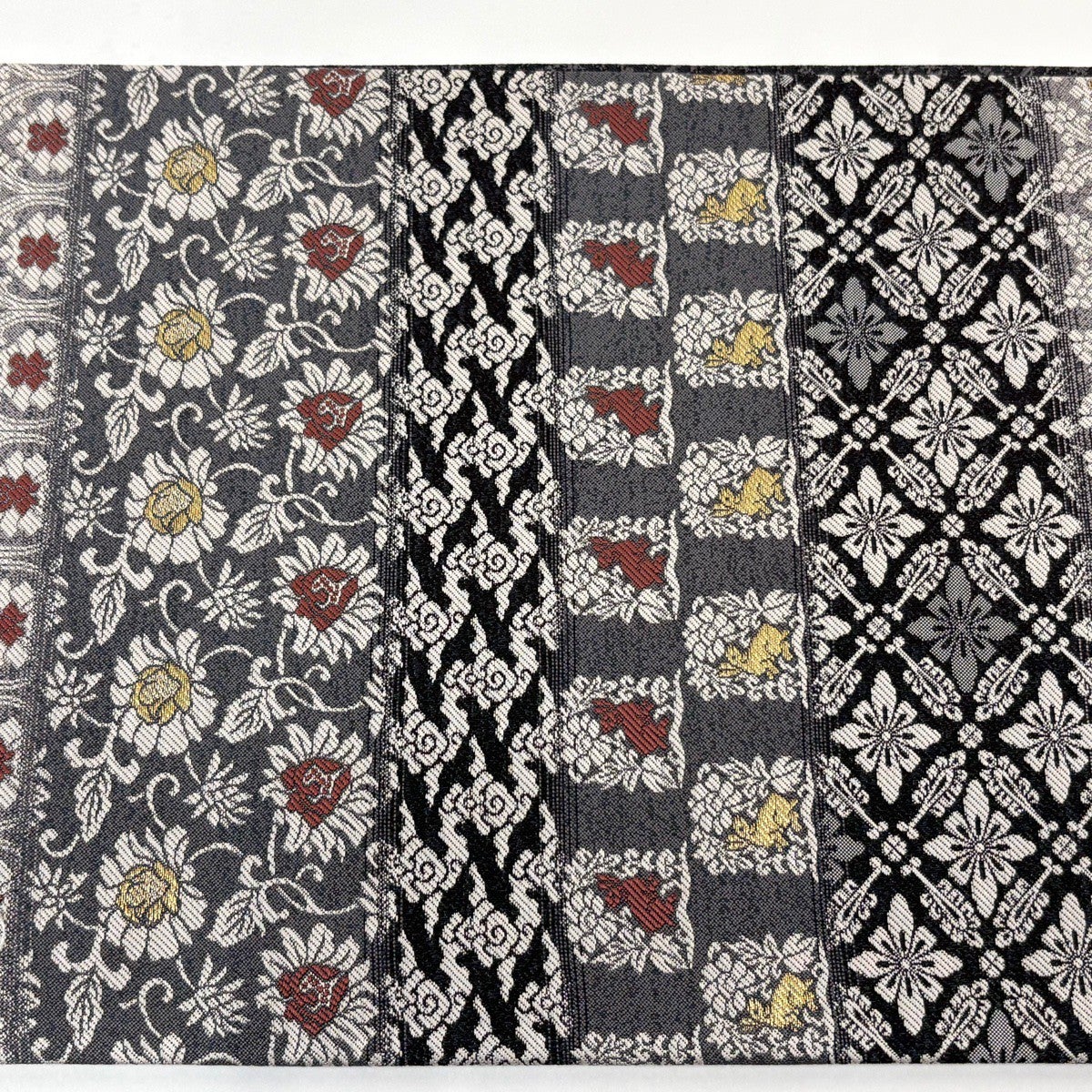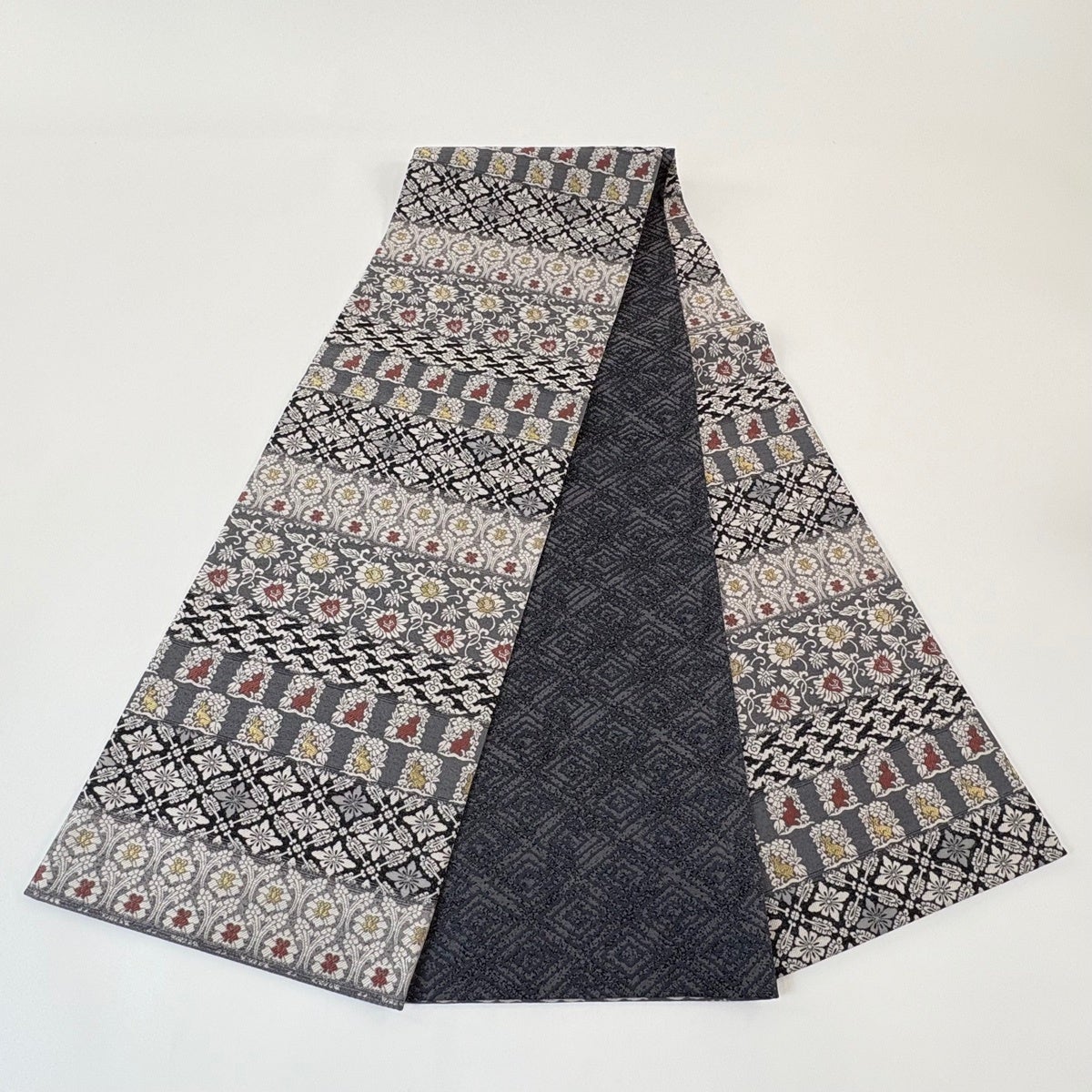 【美品】 袋帯 名品 花唐草 幾何学模様 黒灰 全通 正絹