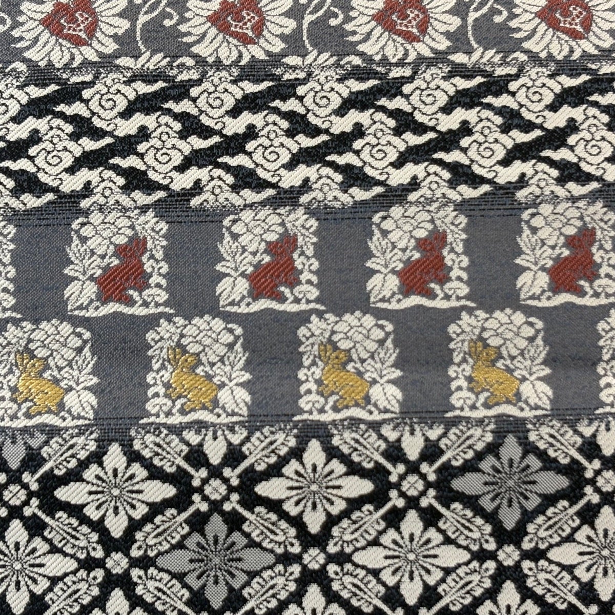 【美品】 袋名古屋帯 名品 草花 花うさぎ 金糸 黒灰 正絹