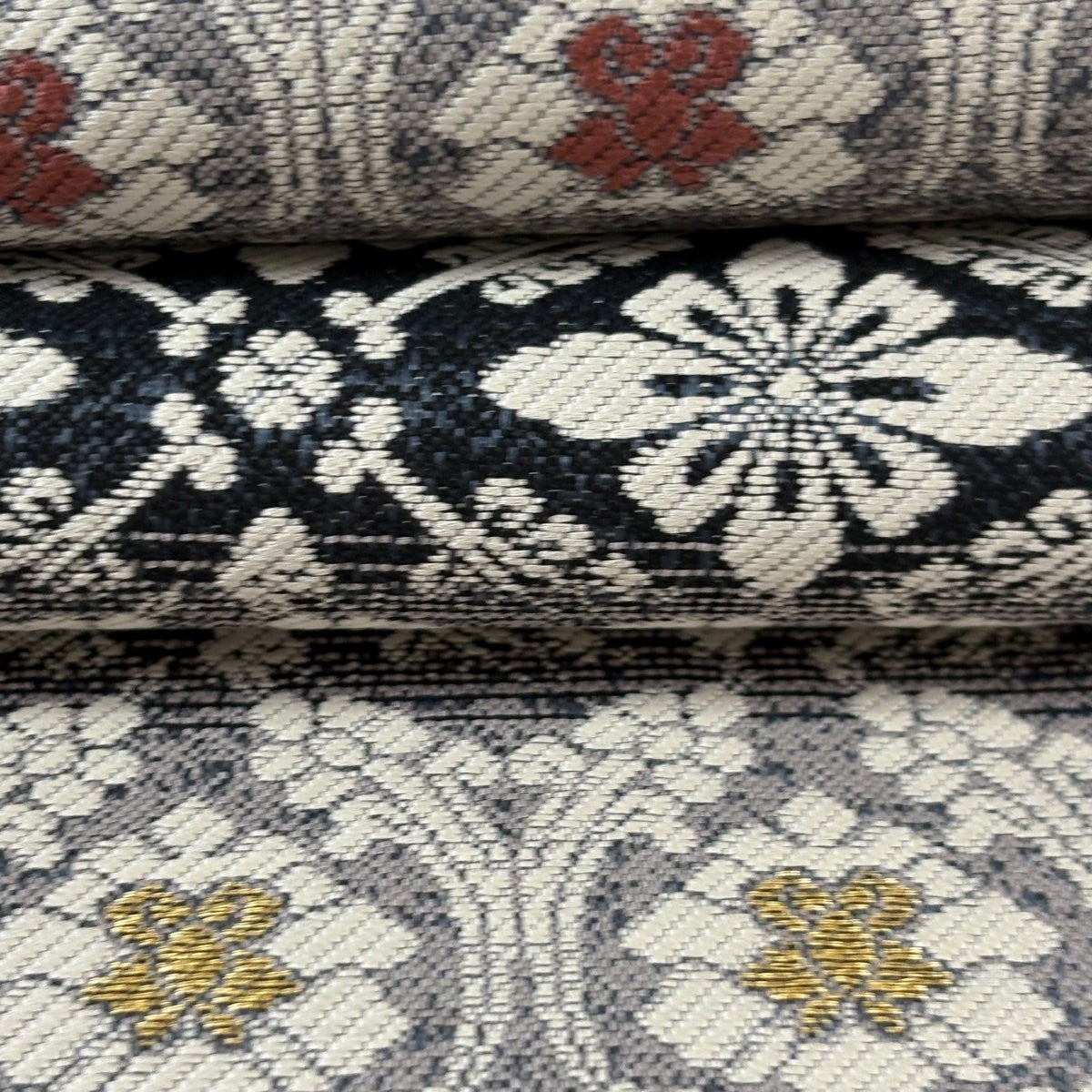 袋帯 秀品 鈴乃屋 草花 華文 金糸 刺繍 黒灰 六通 正絹