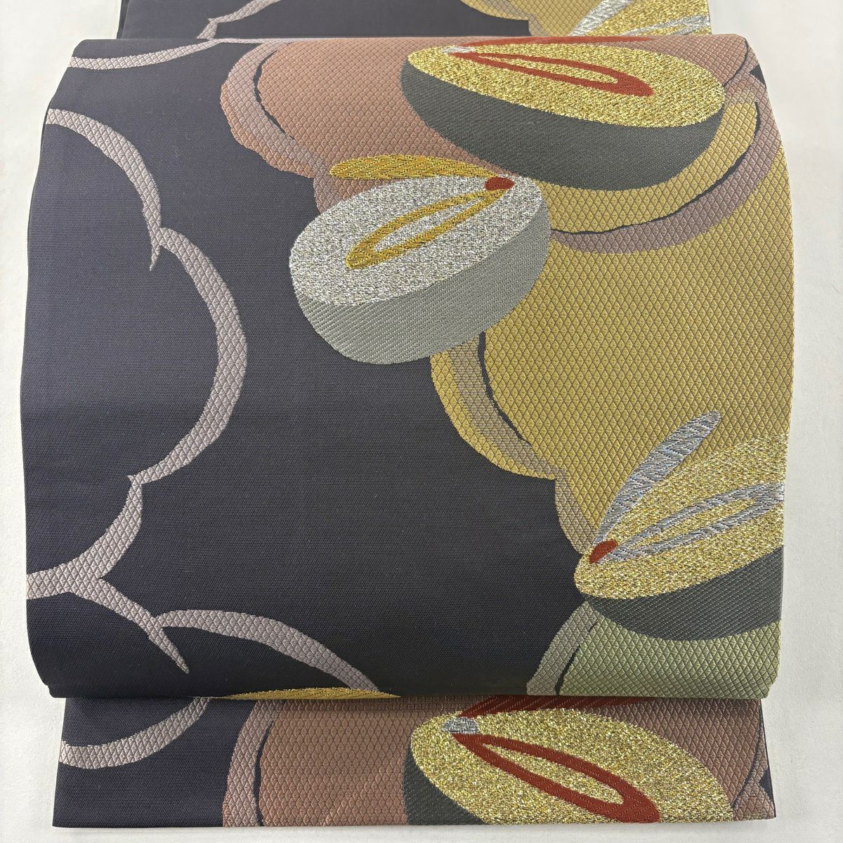 袋帯 秀品 関西仕立て 幾何学模様 菱 箔 墨色 六通 正絹