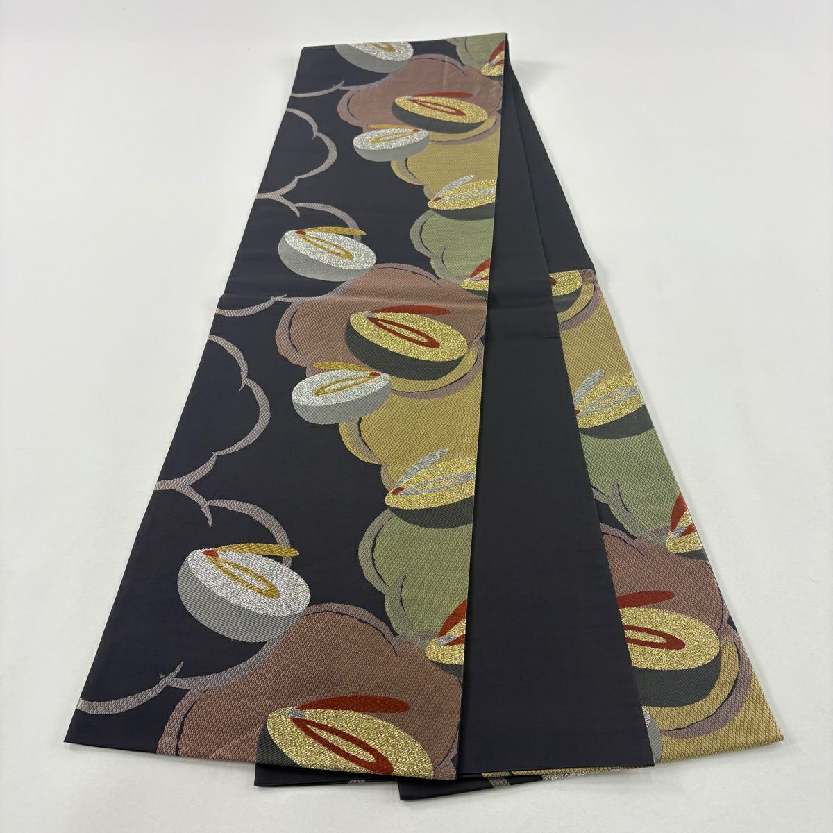 袋帯 秀品 夏帯 葉柄 幾何学 金糸 墨色 お太鼓柄 正絹